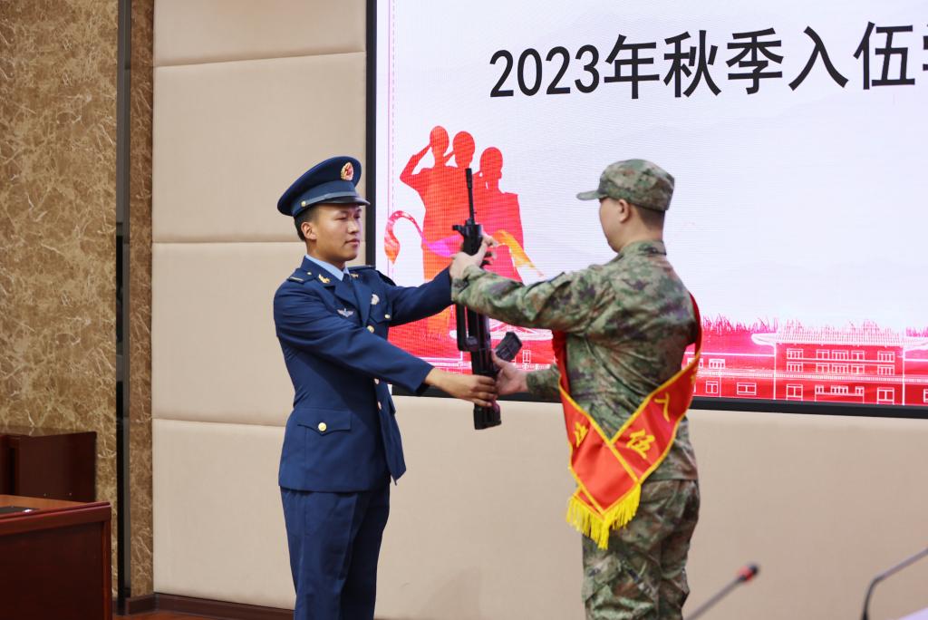 会上举行了授枪仪式,今年秋季刚刚退伍的老兵将代表责任与荣誉的钢枪授予了今年新入伍的学生。