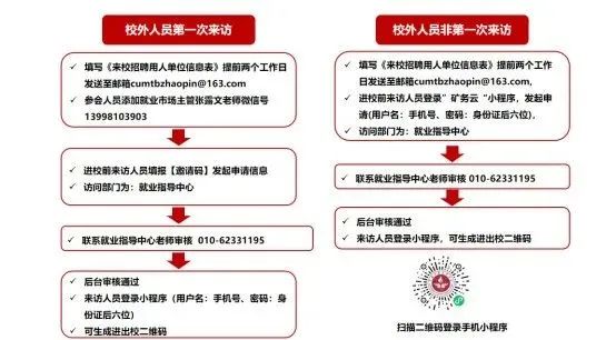 第二步,指派1名用人单位负责人添加我校就业市场主管张露文老师微信(微信号:13998103903),同时所获取的邀请码需转至其他参会人员填报,最晚在入校前一天通过邀请码填报进校申请信息,访问部门为就业指导中心。第三步,填报邀请码申请信息后,就业指导中心审核通过后,可根据《外访人员操作手册》(详见附件2)登录(用户名为手机号、密码为身份证后六位)“矿务云”小程序,出示进出校 “二维码 ”出入教学区。
