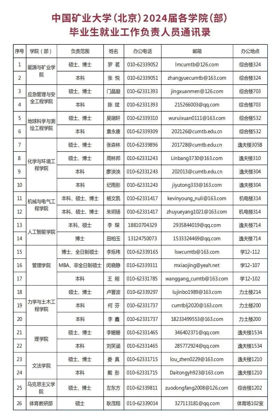 未尽事宜,请及时联系。联系人:张国强(18810536376(同微信))、张露文(13998103903(同微信))联系电话:010-62331195(含传真)电子邮箱:jiuye@cumtb.edu.cn通信地址:北京市海淀区学院路丁11号三号办公楼503室大学生就业创业指导中心(邮编:100083)相关招聘通知安排请持续关注中国矿业大学(北京)就业创业信息网(http://jy.cumtb.edu.cn/)首页及微信公众号“中国矿大北京就业创业”(cumtbjy)。