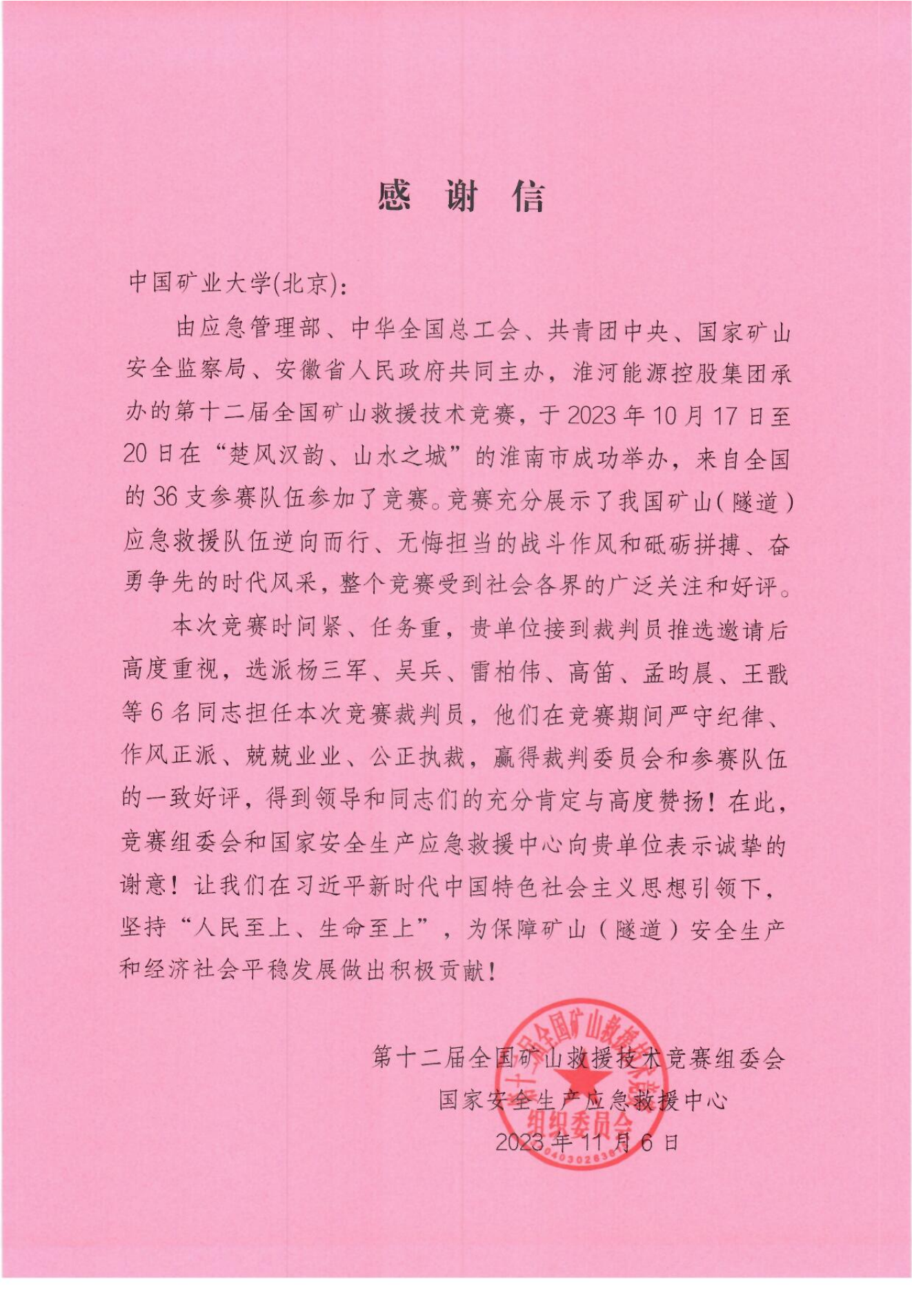 本网讯 近日,国家安全生产应急救援中心给我校发来感谢信,感谢我校对第十二届全国矿山救援技术竞赛的大力支持及应急救援工效与防护研究院吴兵和杨三军带领的裁判员团队在比赛期间做出的突出贡献。