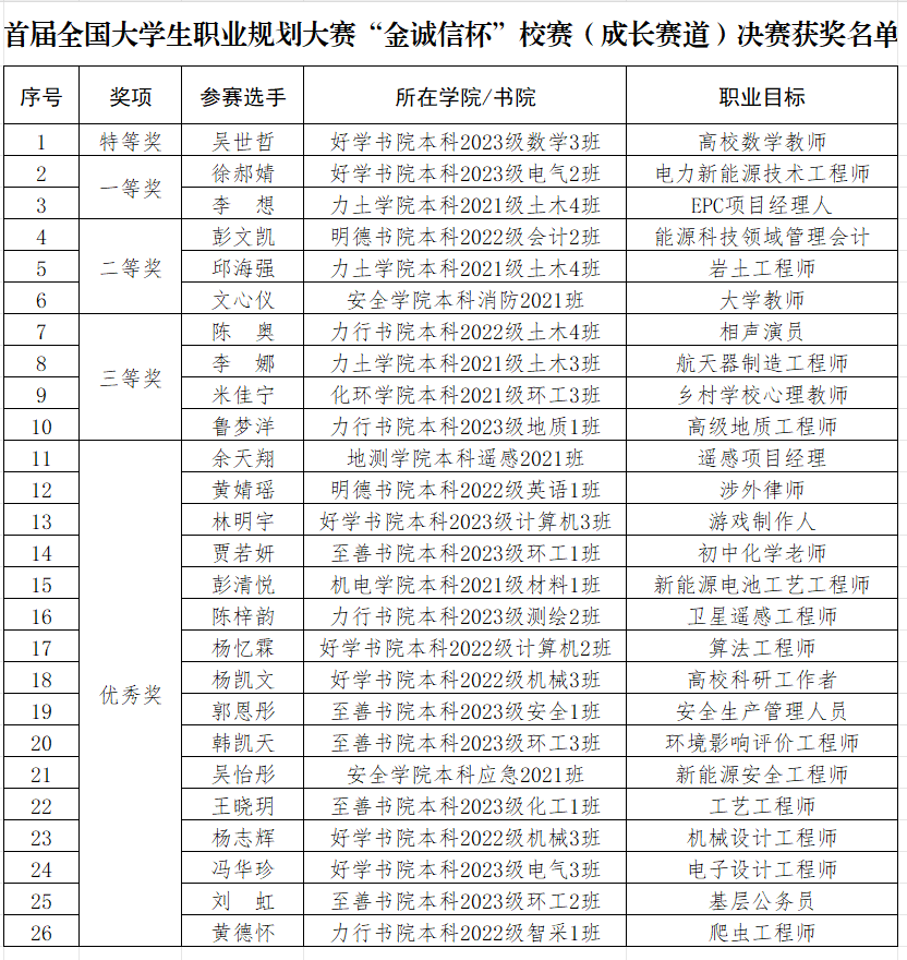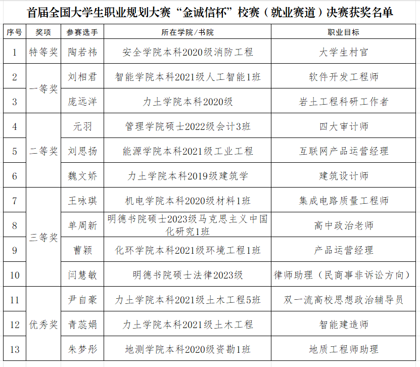 本届大赛的举办,不仅展示了我校学子勇于探索、敢于谋划的精神风貌,也为同学们提供了一个提升职业素养、规划职业生涯的发展平台。学校将以首届全国大学生职业规划大赛为契机,加强职业生涯规划教育与就业指导服务,努力打造课堂教学、自主探索、大赛驱动、指导和榜样引领为一体的生涯教育体系,进一步强化生涯教育、对接就业需求、抓实就业育人,促进矿大学子成长成才。