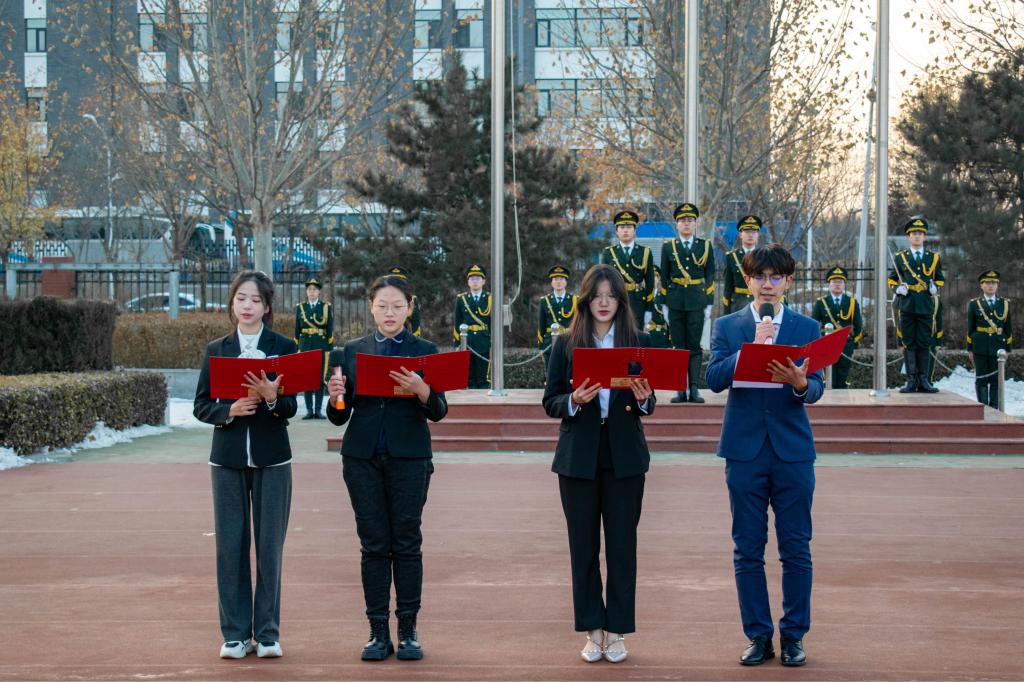 本网讯 冬至阳生,岁回律转。为迎接新年到来,庆祝元旦佳节,丰富校园文化生活,厚植师生家国情怀,2024年1月1日早晨8:00,学校在沙河校区操场举行元旦升旗仪式。校党委副书记安宇,党委学生工作部、党委武装部部长赵麟,党委学生工作部、党委武装部副部长胡欣、童军武,校团委副书记陈旭、能源与矿业学院党委书记高来举、理学院党委副书记张殿勋、文法学院党委副书记董凤娇、各学院辅导员以及300多名学生参加了升旗仪式。