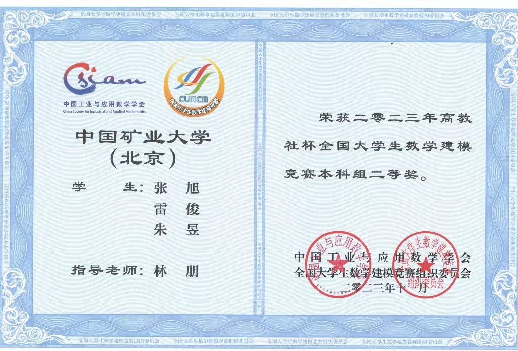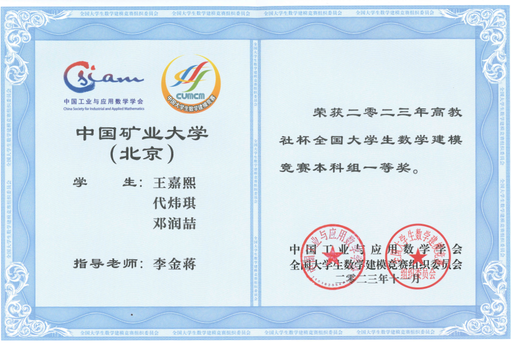 本网讯 2023年全国大学生数学建模竞赛共有来自全国及美国、澳大利亚和马来西亚的16835院校/校区、59611个队(我校仅参加本科组比赛,共54158个队)、近18万名大学生报名参加,创历年来参赛人数新纪录。我校理学院教师带队参赛,成功报名参赛的队伍共计40支。理学院王嘉熙、代炜琪、邓润喆获得本科组全国一等奖。由于参赛队伍逐年增加而获奖队伍数固定,获奖率每年下降,今年全国一等奖获奖率约为0.55%。理学院张旭、雷俊和人工智能学院朱昱获得全国二等奖,获奖率约为2.2%。