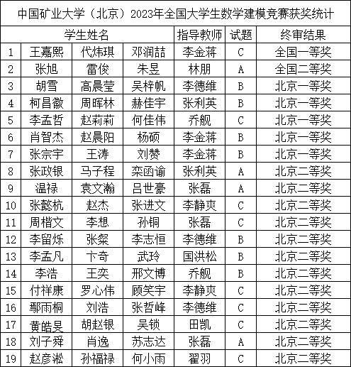 竞赛组委会将三道赛题每题获得国家奖的队伍数固定为一等奖100个,二等奖300个。我校共计斩获国家级奖项2队,北京市一等奖5队,北京市二等奖12队,综合获奖率接近50%,高于赛事的平均获奖率,这是我校近年来取得的最好成绩。