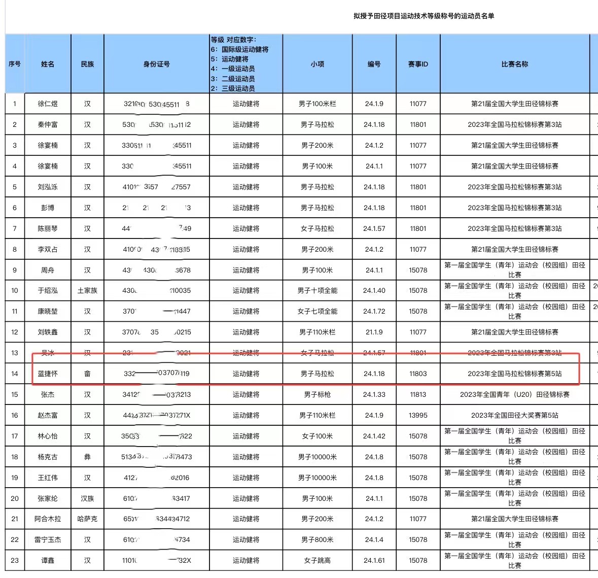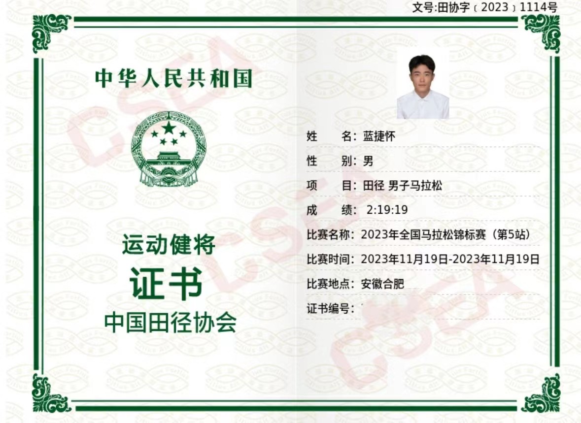 本网讯 近日,中国田径协会发布《关于授予运动健将称号运动员的通知》,对拟授予田径项目运动健将称号的23名运动员进行公示,我校体育教研部2022级运动训练专业研究生蓝捷怀位列其中,被授予运动健将称号,这是我校体育教研部成立以来,首个由我校自主培养获此称号的学生。此前,蓝捷怀于去年11月参加2023全国马拉松锦标赛(第五站),以2:19:19的个人最好成绩获得男子马拉松第16名。