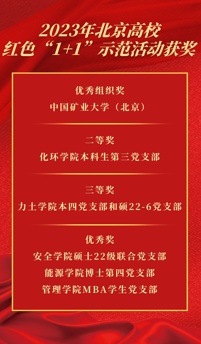 本网讯 在北京市教工委举办的2023年北京高校红色“1+1”示范活动评选中,我校化环学院本科生第三党支部从北京市1615个高校学生党支部共建活动项目中脱颖而出,获评二等奖;同时,一个党支部获评三等奖,三个党支部获评优秀奖。北京15所高校获优秀组织奖,我校再次位列其中。