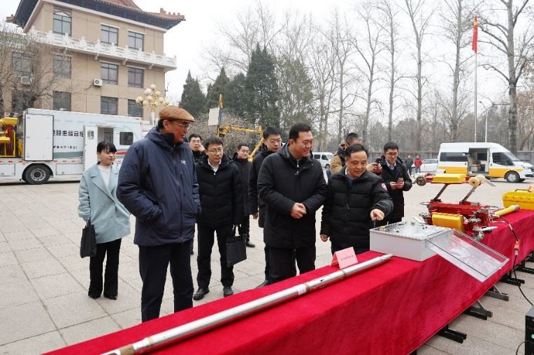 彭苏萍院士介绍了城市道路及地下空间安全检测与评价应急部重点实验室、燃料电池研究中心建设进程,并在民族楼广场展示了系列产品及在重大工程中的应用情况。地质雷达系列装备可实现城市道路及地下空间的“CT体检”,使城市道路及地下空间安全问题得到有效解决。固体氧化物燃料电池是能源革命性技术,能源转化效率高,将为“双碳”目标的实现提供充分保障。
