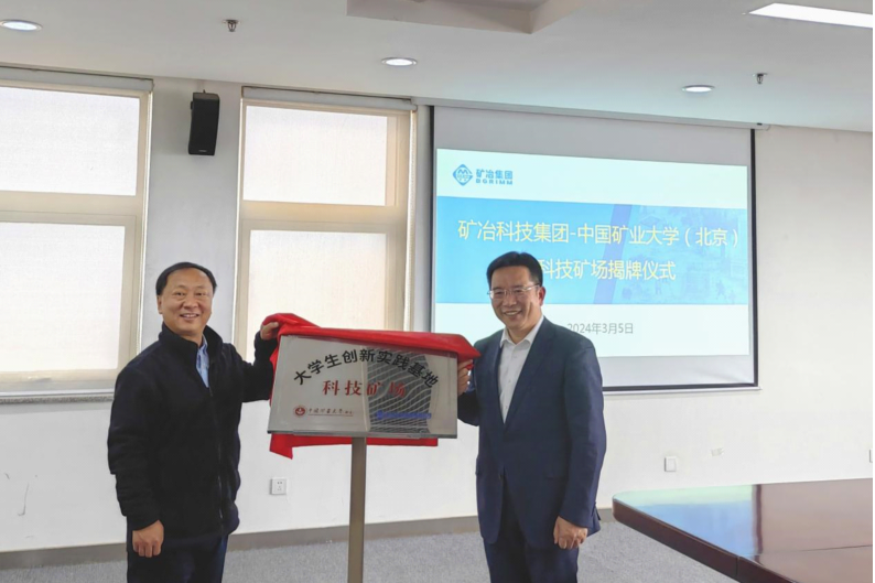 随后,刘波与王海北共同为大学生实习实践教育基地-科技矿场揭牌。中国矿业大学(北京)与矿冶集团有限公司共建的实习实践教育基地是双方经过充分协商,决定在矿冶集团设立矿物加工工程、碳储科学与工程、化学工程与工艺、环境工程等专业实习实践教育培训基地,充分整合各自资源,使科技矿场真正成为学生的党建引领基地、实习实践基地、创新基地和就业基地。