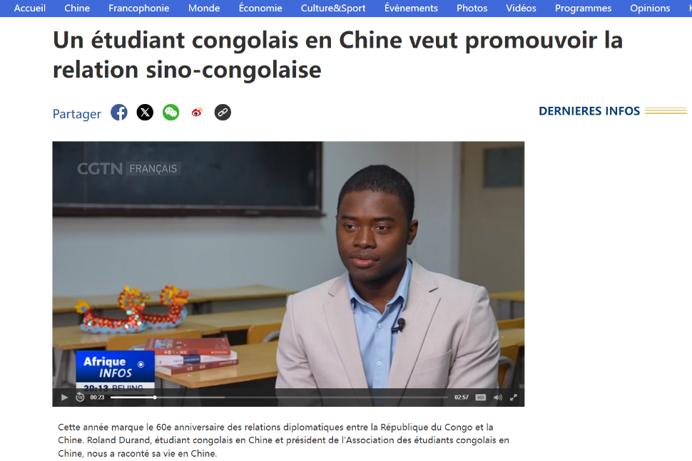 本网讯 今年是刚果共和国与中国建交60周年。2月22日,国家主席习近平同刚果(布)总统萨苏互致贺电,庆祝两国建交60周年。近日,我校刚果共和国留学生Roland Durand(罗兰达)作为优秀在京留学生代表接受中国国际电视台采访,讲述他在中国的生活。