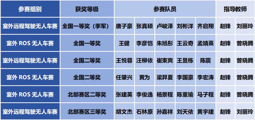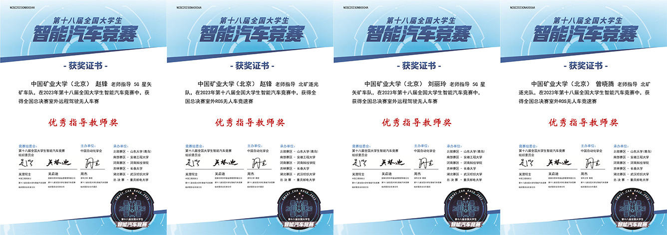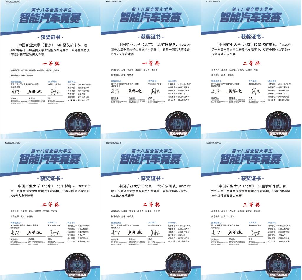 我校参赛队伍凭借出色的技术运用和团队协作,在全国总决赛中,“北矿逐光队”队和“北矿掣电队”分别获得室外ROS无人车赛全国一等奖和全国二等奖,“5G星矢矿车队”和“5G星移矿车队”分别获得室外远程驾驶无人车赛全国一等奖和全国二等奖的好成绩。此外,在北部区域选拔赛中,我校“北矿驭风队”和“5G星瞬矿车队”分别获得室外ROS无人车赛北部赛区二等奖和室外远程驾驶无人车赛北部赛区三等奖。其中“5G星矢矿车队”获室外远程驾驶无人车赛全国季军,创造了我校自参加该项竞赛以来的历史最好成绩。