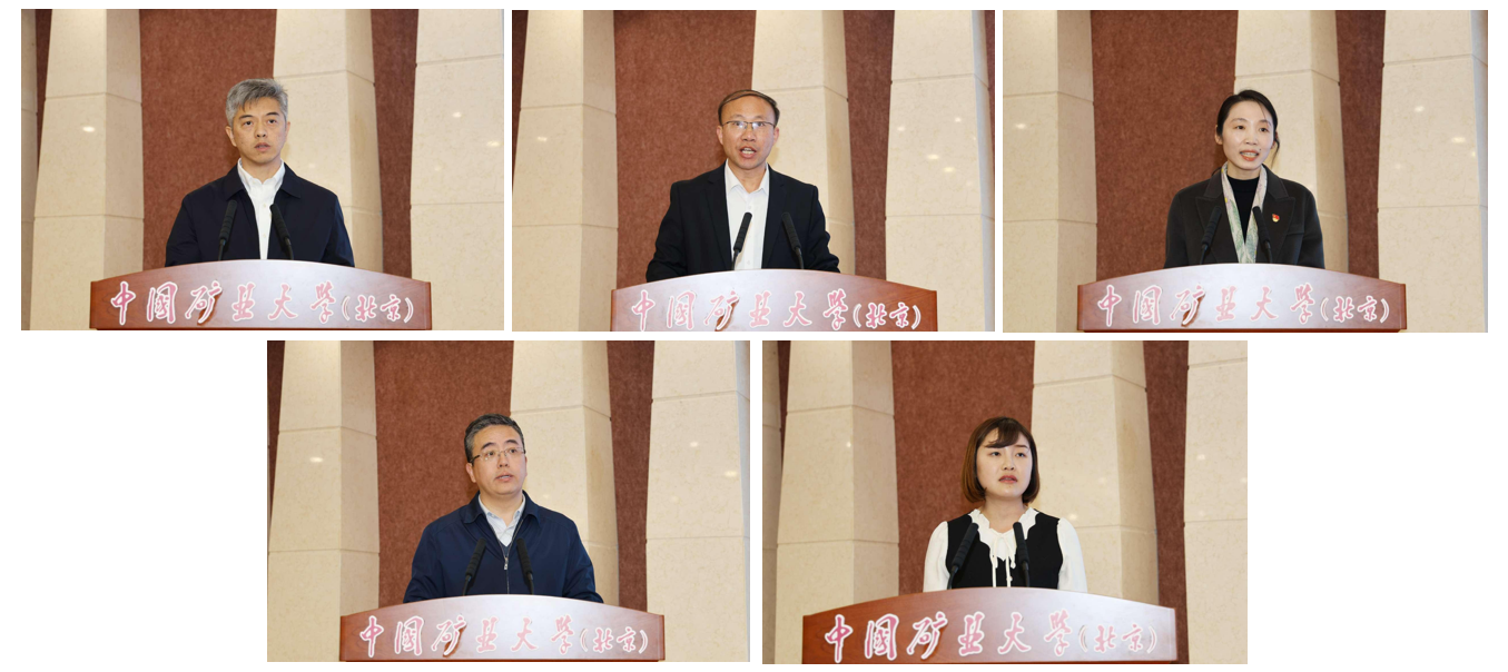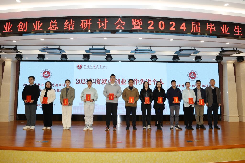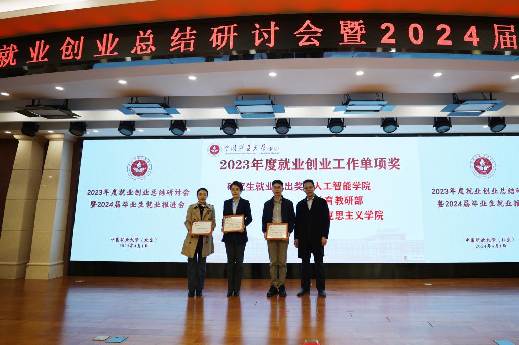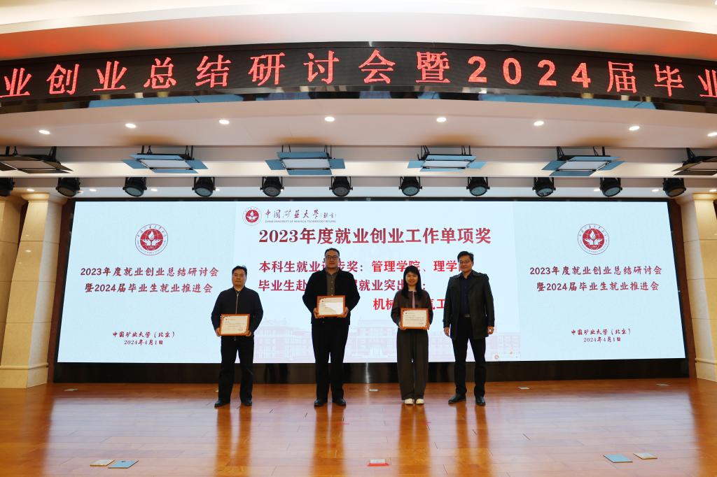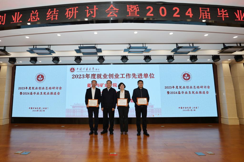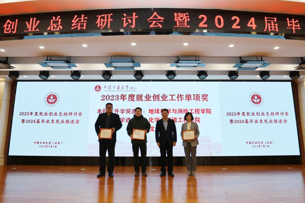 徐孝民为获得2023年度就业创业工作先进单位的学院颁发奖牌,刘波为获得2023年度本科生升学突出奖、本科生升学进步奖的学院颁发奖牌,崔希民为获得2023年度研究生就业突出奖的学院颁发奖牌,谭凯为获得2023年度本科生就业进步奖、毕业生赴西部基层就业突出奖的学院颁发奖牌,魏名山为获得2023年度就业创业工作的先进个人颁发荣誉证书。