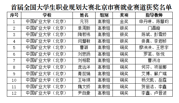 北京市教委于2023年10月启动首届全国大学生职业规划大赛北京市赛,共有76000余名学生参赛。我校于2023年11月至12月组织开展校赛选拔,来自12个学院的800余名选手报名参赛,在成长赛道和就业赛道高教组的比赛中共有21名选手脱颖而出,晋级市赛的比拼。参赛学生立足自身的专业特点和行业需求,围绕自身未来规划与职业目标、个人在校期间的学习成长、实习实践经历、个人综合素质、职业发展规划等方面进行了充分的展示。最终,在市赛成长赛道和就业赛道高教组的比赛中我校夺得2项金奖、6项银奖、13项铜奖的佳绩,充分展现了矿大学子的能力素质与责任担当。其中,艾博、陈慧昀、申丹琳、杨灏被评为北京市赛优秀指导教师。