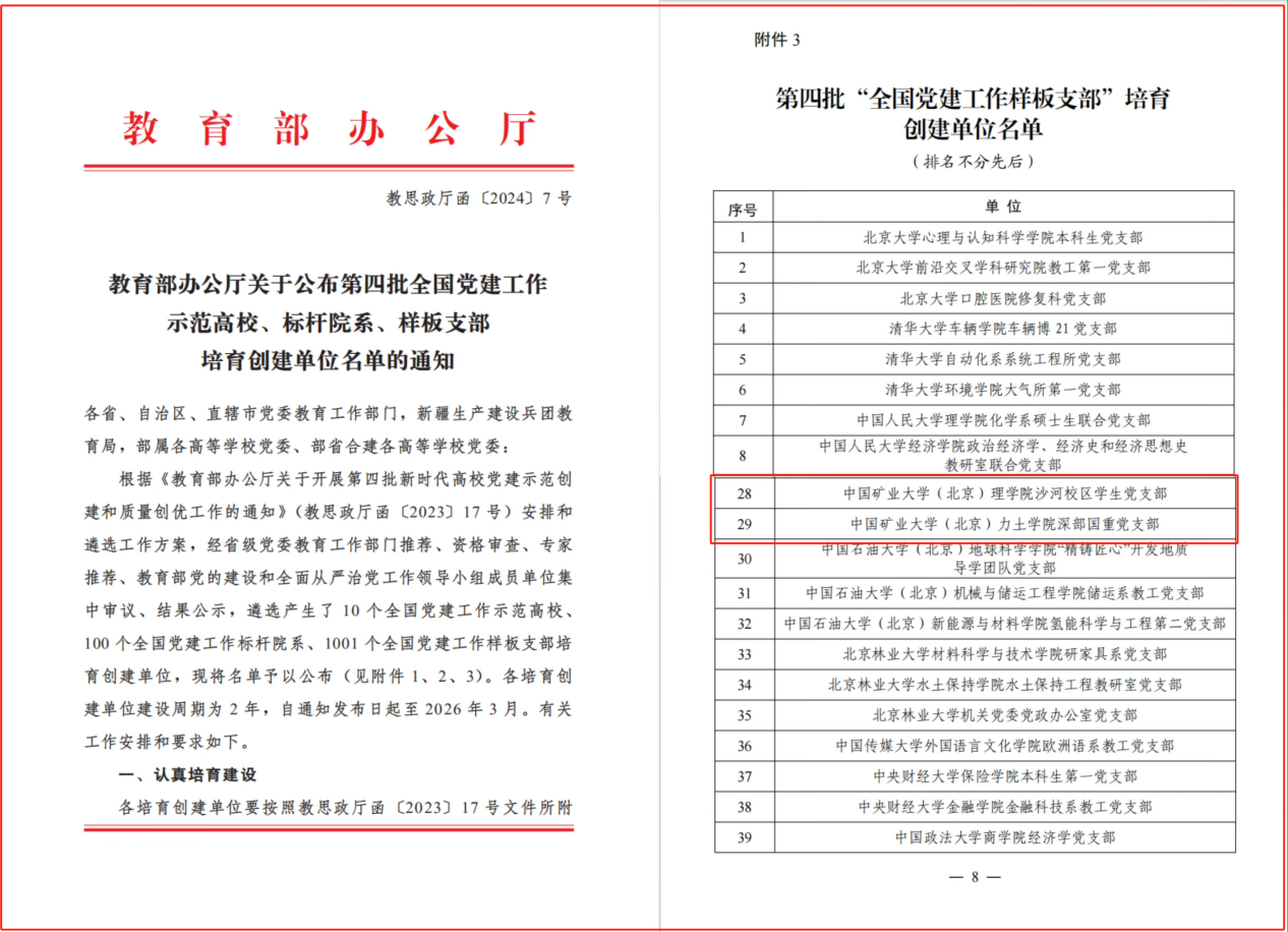 本网讯 近日,教育部下发了《关于公布第四批全国党建工作示范高校、标杆院系、样板支部培育创建单位名单的通知》(教思政厅函[2024]7号),经省级党委教育工作部门推荐、资格审查、专家评审、教育部党的建设和全面从严治党工作领导小组成员单位集中审议、结果公示,遴选产生了10个全国党建工作示范高校、100个全国党建工作标杆院系、1000个全国党建工作样板支部。我校力学与土木工程学院深部国重党支部和理学院沙河校区学生党支部入选“全国党建工作样板支部”培育创建单位。截至目前我校共7个党支部入选“全国党建工作样板支部”培育创建单位。