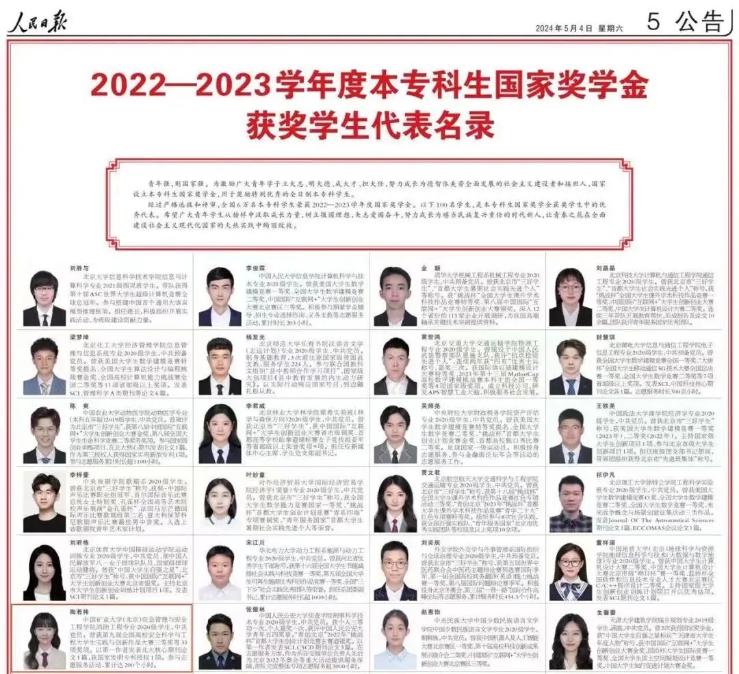 多年来,学校本着公开、公平、公正、择优的原则,严格按照国家政策认真组织开展国家奖学金评审工作。2017-2023年,报送的国家奖学金获奖学生代表连续七年入选《本专科生国家奖学金获奖学生代表名录》,并在《人民日报》刊登。