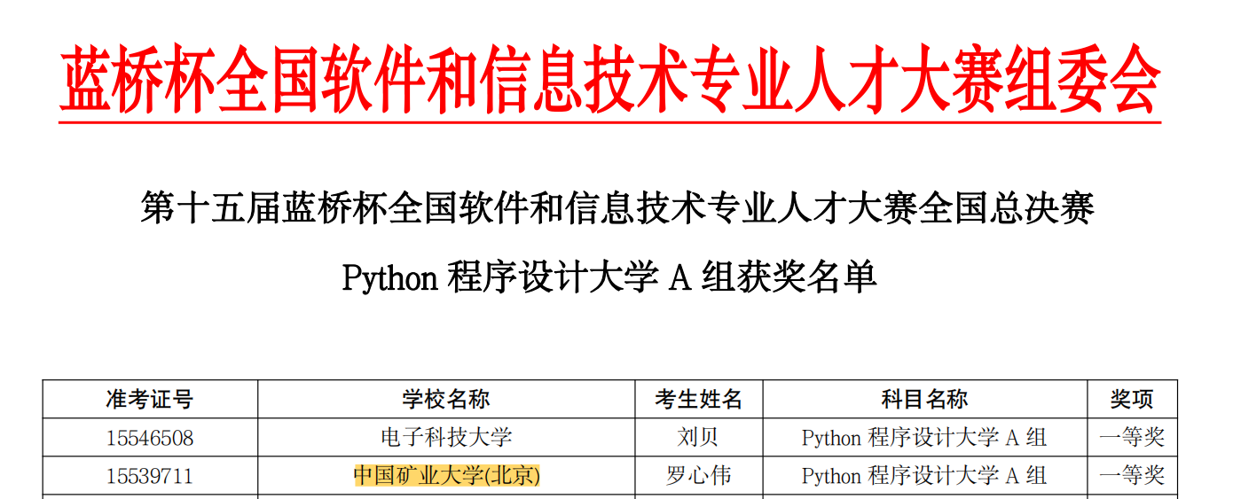 本网讯 近日,第十五届“蓝桥杯”全国软件和信息技术专业人才大赛落幕。我校学子在北京赛区比赛中取得成绩优异,共有156名同学获奖,其中一等奖10名,二等奖34名,三等奖112名。经过6月1日全国总决赛的角逐,最终罗心伟同学获得全国一等奖,赫佳宇获得全国二等奖,郭天茁、杨文强、杜若琳3位同学荣获三等奖,周发顺、许正扬、梁卲锟获得优秀奖。