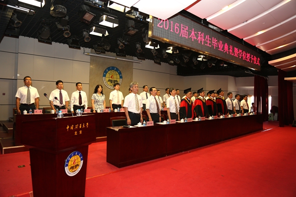 上午8:00,典礼在庄严的国歌声中始。范迅宣读了“2016届本科毕业生学位授予名单”,姜耀东宣读了“2016届留学生学位授予名单”。徐孝民、杨仁树、钱鸣高、武强为毕业生们依次拨穗正冠,授予学士学位证书。
