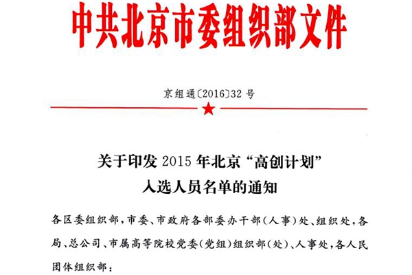 据了解,"高创计划"全称为北京高层次人才创新创业支持计划,主要围绕首都经济社会发展需要,有计划、有重点地遴选支持一批自然科学、工程技术以及哲学社会科学和文化艺术领域的领军人才、青年拔尖人才,支持能够代表国家一流水平、具有领军才能和团队组织能力的高层次人才。2015年北京“高创计划”共评选出14名杰出人才、88名领军人才和50名青年拔尖人才。