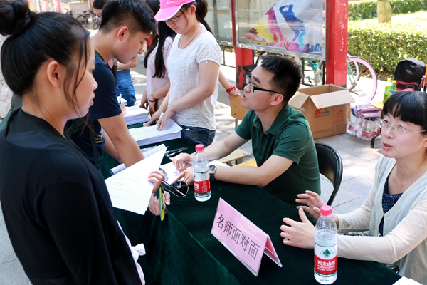 活动现场分为“名师面对面”、“通关宝典发放”、“资助政策咨询”三个板块。“名师面对面”板块特邀我校文法学院英语系王振英、古明2名教师在现场与学生交流学习英语的心得体会,到场学生纷纷向老师们提出了自己在学习英语以及复习四六级考试过程中遇到的疑问,老师们结合自己的教学经验为同学们进行了耐心细致的讲解。“通关宝典发放”板块为到场学生发放了两位老师精心准备的英语四六级考试复习材料,受到了广大同学的热烈好评,同学们针对复习资料互相交流、探讨,现场气氛异常热烈。“资助政策咨询”板块由学生资助管理中心的工作人员对前来咨询的同学就国家助学贷款、补偿代偿、困难补助等问题进行了解答,并对现场同学发出诚信考试倡议。