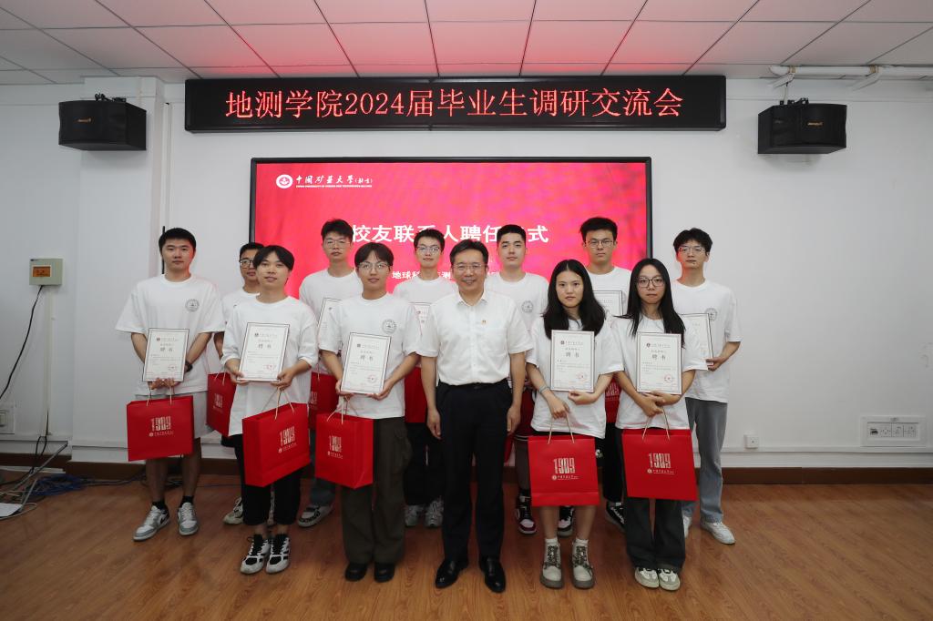会上,刘波为地测学院校友联系人代表颁发聘书并赠送纪念品,希望校友联系人更好地担负起促进校友互动、传递母校声音、增进校友与学校紧密联系的职责,凝聚校友和社会各界力量,助力世界一流能源科技大学建设。