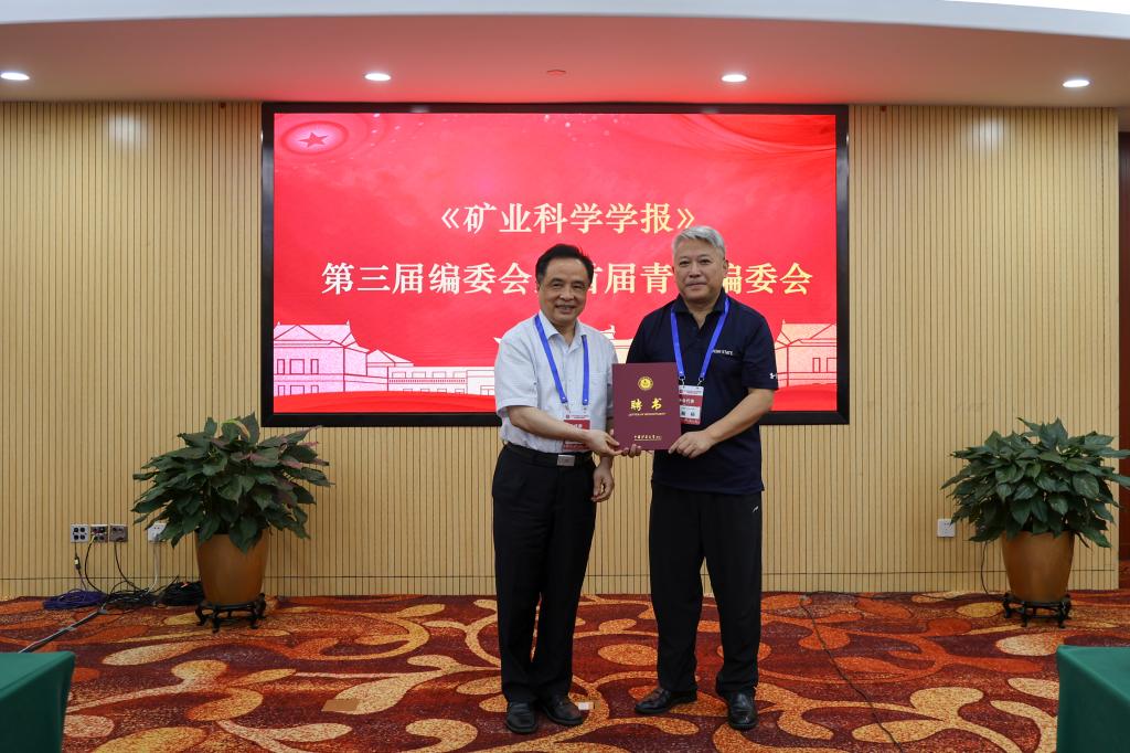 随后,彭苏萍院士宣读了《矿业科学学报》第三届编委会组成名单。本届编委会由88名国内专家学者和6名海外专家学者组成。彭苏萍主编和刘波校长共同为到会的编委委员颁发聘书并合影留念。