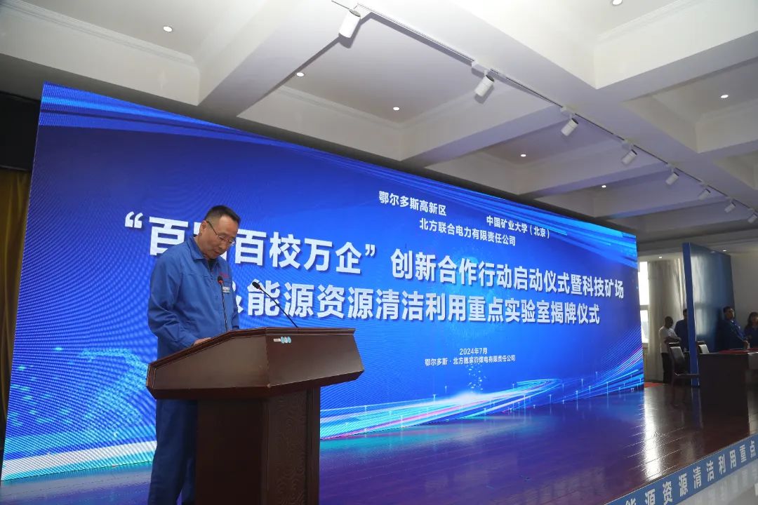 刘波在致辞中表示,能源资源清洁利用是关乎国家能源安全、生态环境保护和经济可持续发展的重大课题,也是中国矿业大学(北京)及内蒙古研究院肩负的重要使命。此次揭牌签约,将以“政、产、学、研、用”的深度融合,催生更多产业科技合作硕果,推动“园区+高校+企业”合作迈上新台阶、开辟新境界。他表示,“科技矿场”和“能源资源清洁利用重点实验室”的成立,是双方优势互补、资源共享的结晶。双方秉持培养“家国情怀、精英素养、能源特质”的高素质创新人才育人理念,将“科技矿场”建设成“思政育人基地”“创新实践基地”“实习实训基地”“人才就业基地”四位一体的人才培养综合平台,努力构建人才培养、科技创新、社会服务有机结合的实践育人模式,打造实践育人新范式。华能集团与学校有着深厚合作基础,北方联合电力有限责任公司为学校及内蒙古研究院提供了宝贵实际应用场景,使科学研究更加贴近市场需求,具有针对性和实效性,实现一流科技支撑服务,服务一流成果转化应用,助力一流校企发展。