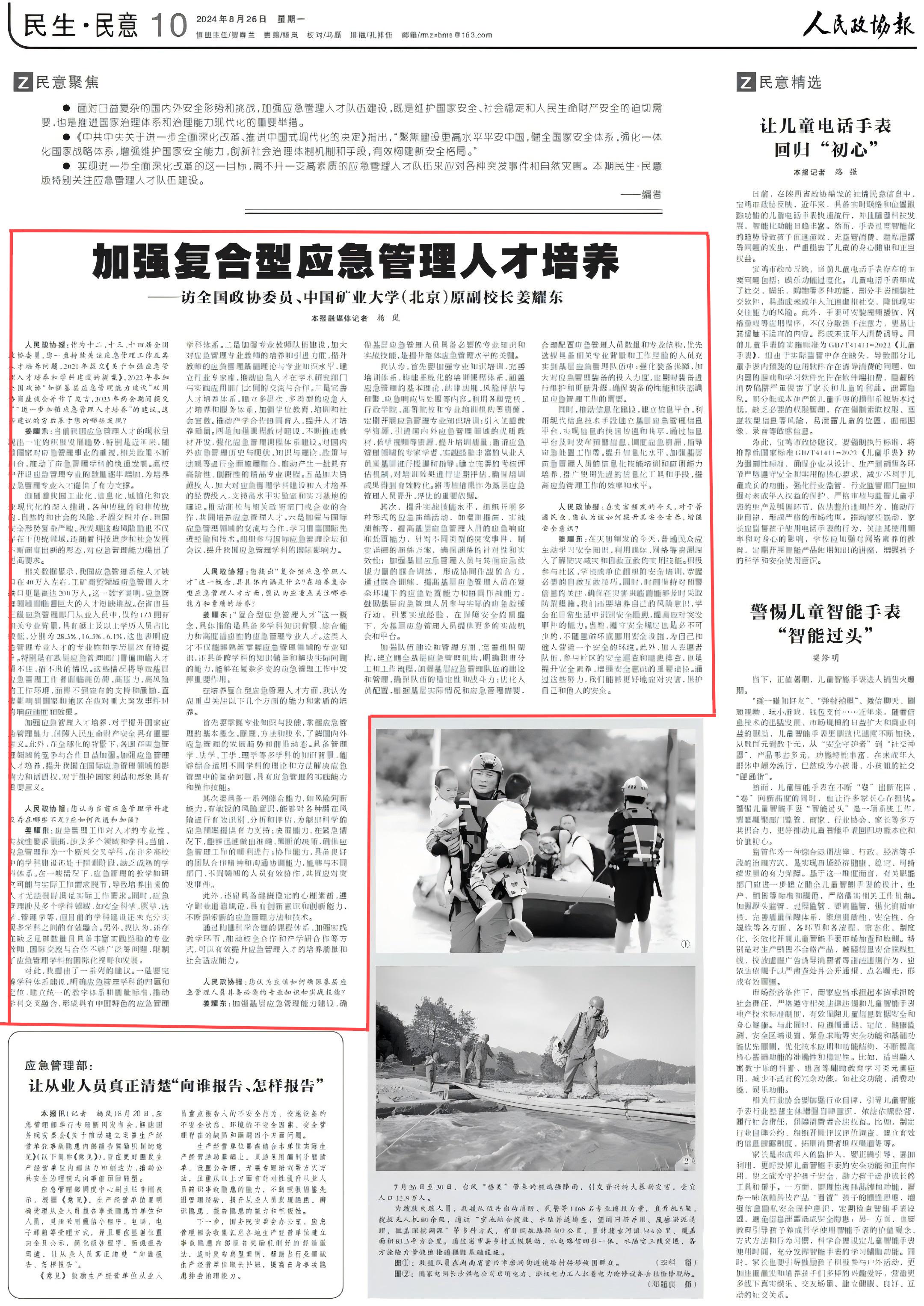 加强复合型应急管理人才培养——访全国政协委员、中国矿业大学(北京)原副校长姜耀东