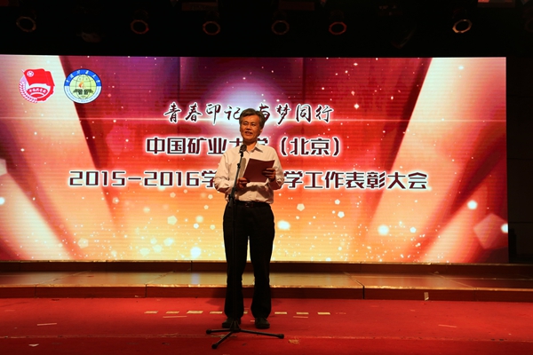 朱书全在表彰大会上作重要讲话。他首先代表学校党委,向受表彰的先进集体和个人表示热烈祝贺,向长期以来关心青年成长,致力于青年事业发展的同志们表示衷心感谢。朱书全说,党对青年人寄予厚望,关心青年人的成长成才。他向全校青年学生们提出希望:希望大家继续深入推进“四进四信”活动,牢固树立跟党走中国特色社会主义道路的理想信念,在青年时期树立正确理想信念和世界观、人生观、价值观,切切实实坚定“主心骨”、补足“精神钙”、筑牢“压舱石”,更好地把“个人梦”与“中国梦”结合起来,在实现中华民族伟大复兴的大业中实现青春梦想。希望大家坚持开展“三走”活动,增强身心健康,促进自身综合素质全面发展,把“三走”活动的开展同培育和践行社会主义核心价值观、校园文化建设、学生素质拓展、塑造健康生活方式等有效结合起来,让“三走”活动在促进大学生体育锻炼意识提升、习惯养成、意志磨练、体质增强、健康成长方面发挥出更加重要的作用,从而带动志愿公益、社会实践、创新创业更好地成为矿大校园内经久不息的风尚。希望大家坚持践行“好学力行”的学风,不断提高自我,努力成为能担重任、可堪大用的栋梁之材。他鼓励青年学生要把学习作为一种责任、一种追求、一种有远见的生活方式,让大学生活充满精彩、自信满怀地走在实践和创新的最前列、确保青春之船乘风破浪、勇往直前,不会“说翻就翻”。最后,朱书全说,“长江后浪推前浪”的历史规律不会改变,青年人朝气蓬勃,充满青春的意气,在学校党委和上级团组织的正确领导下,在优秀青年教师和同学的标杆带领下,不忘秉承艰苦奋斗的创业精神和迎难而上的拼搏精神的“小煤球”们,一定能够坚定理想信念、牢记历史使命、勤奋求实、进取奉献,积极践行社会主义核心价值观,为实现中华民族伟大复兴的中国梦而不懈奋斗,为把学校建成特色鲜明、国际知名的高水平矿业大学做出积极贡献。