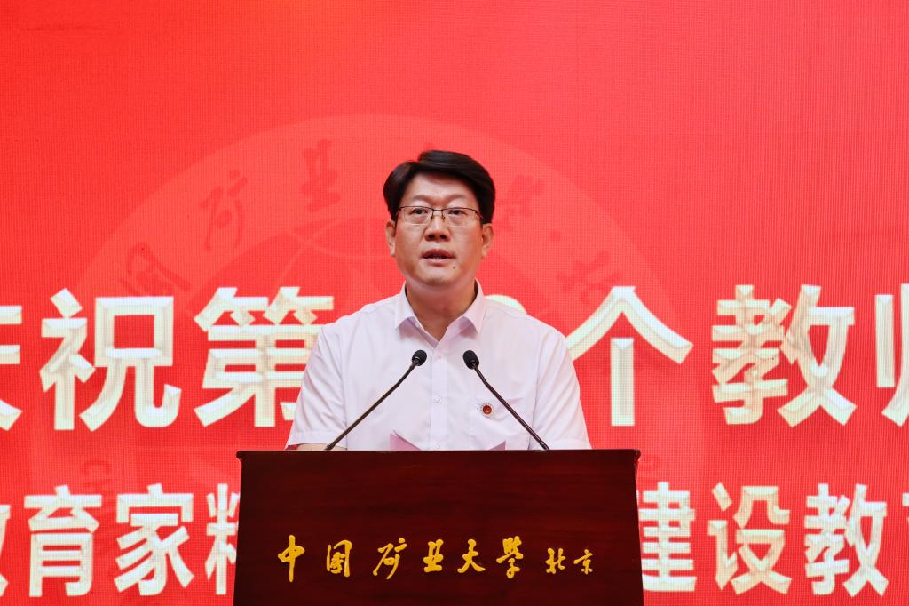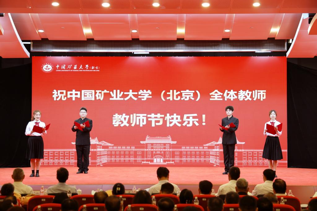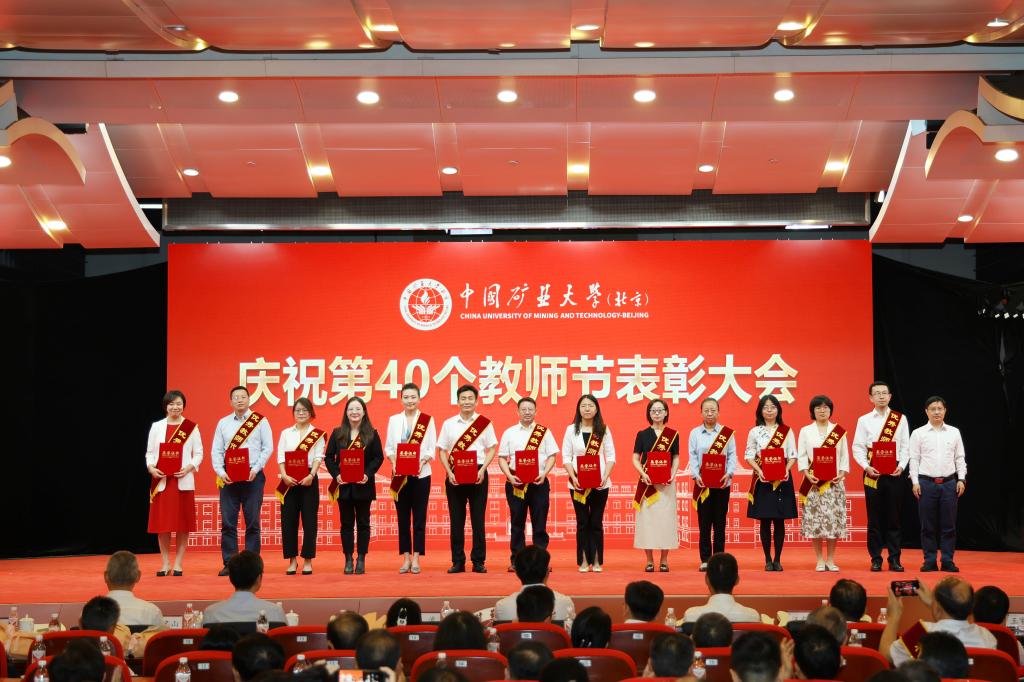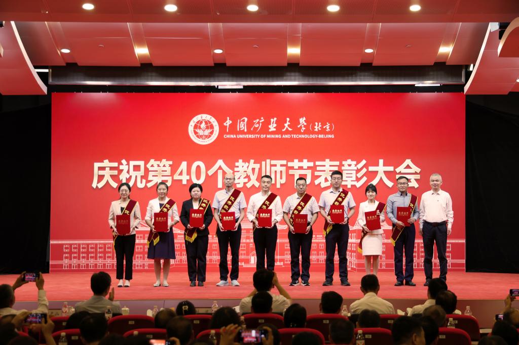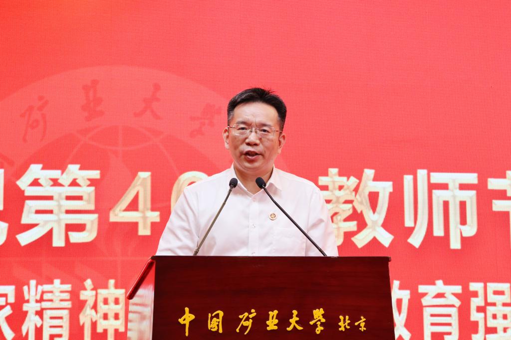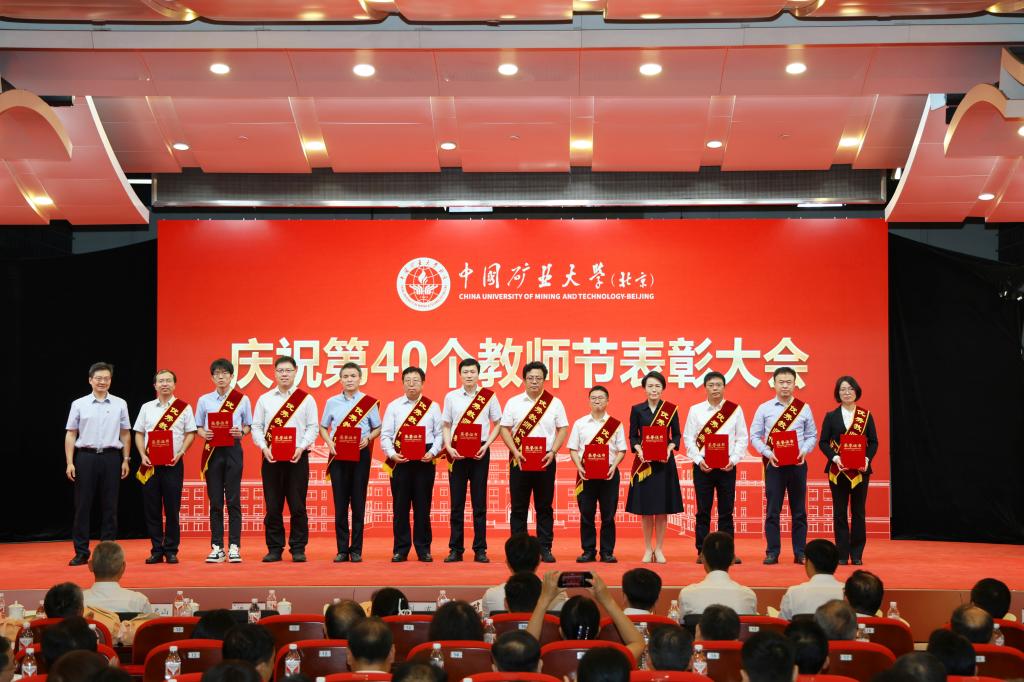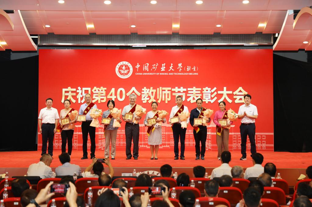 本网讯 强国必先强教,强教必先强师。9月10日下午,中国矿业大学(北京)庆祝第40个教师节表彰大会在科技会堂举行,学习贯彻习近平总书记在全国教育大会上的重要讲话精神。大会以“大力弘扬教育家精神 加快建设教育强国”为主题,表彰荣休教师、从事教育工作满30年教师,以及在党建思政、教书育人、科技创新等领域取得优异成绩的教师代表。校党委书记韩尚峰发表讲话。校长、党委副书记刘波主持会议。副校长崔希民、谭凯、汪文生,校党委副书记、纪委书记魏名山,原校领导朱书全、董晞、王家臣出席大会,党政机关、各学院(部)有关负责人、教师代表、学生代表参加大会。