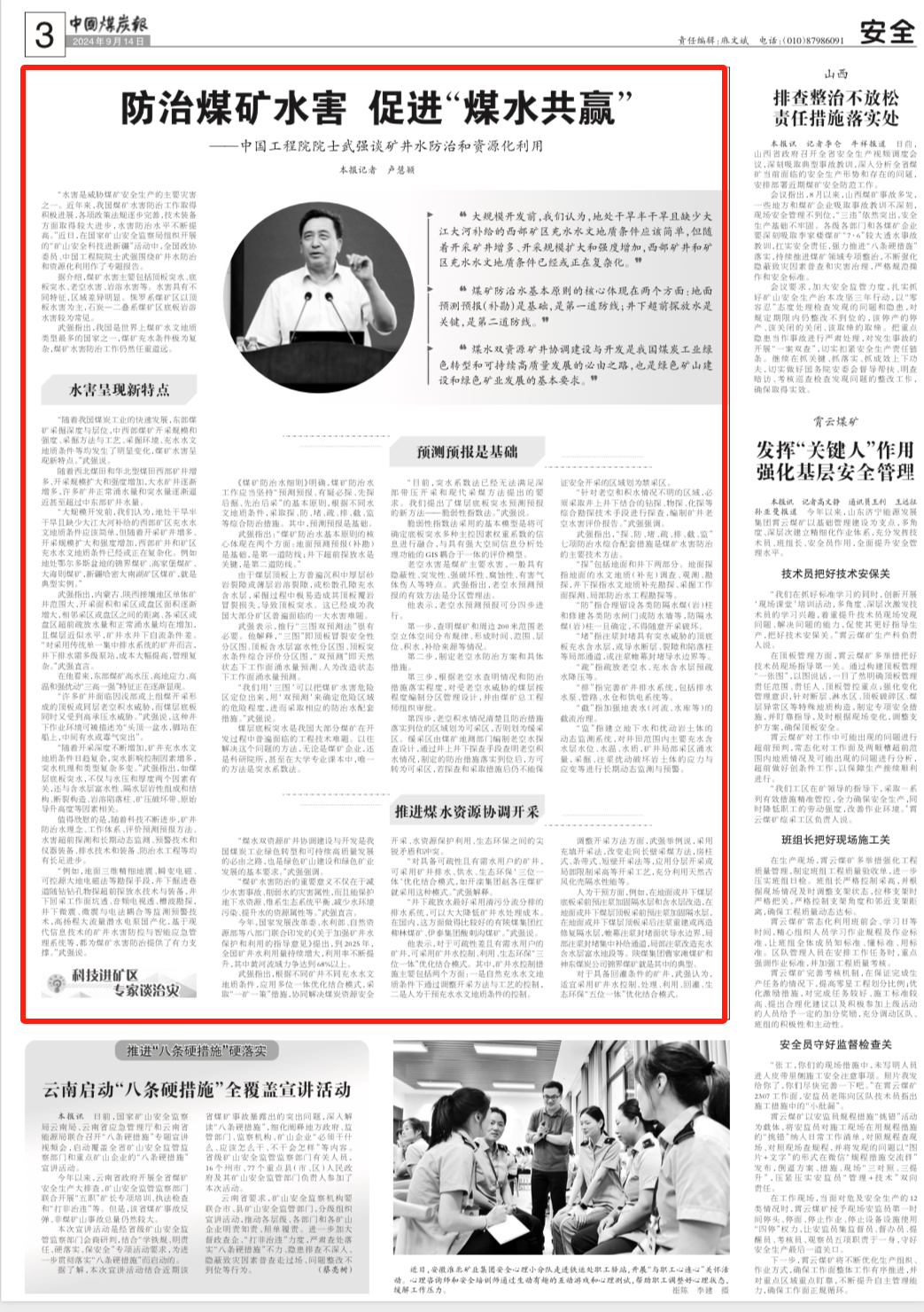 “水害是威胁煤矿安全生产的主要灾害之一。近年来,我国煤矿水害防治工作取得积极进展,各项政策法规逐步完善,技术装备方面取得较大进步,水害防治水平不断提高。”近日,在国家矿山安全监察局组织开展的“矿山安全科技进新疆”活动中,全国政协委员、中国工程院院士武强围绕矿井水防治和资源化利用作了专题报告。