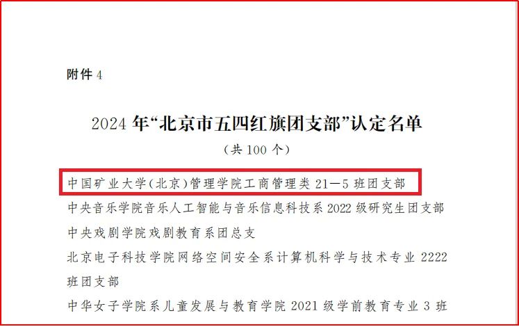 本网讯 近日,共青团北京市委员会正式公布了关于2024年“北京市优秀共青团员、优秀共青团干部、五四红旗团委(团支部)、优秀少先队员、优秀少先队辅导员、优秀少先队集体”认定结果,经二级团组织推荐、参评初审等程序,中国矿业大学(北京)管理学院工商管理类2021-5班团支部获评“北京市五四红旗团支部”。