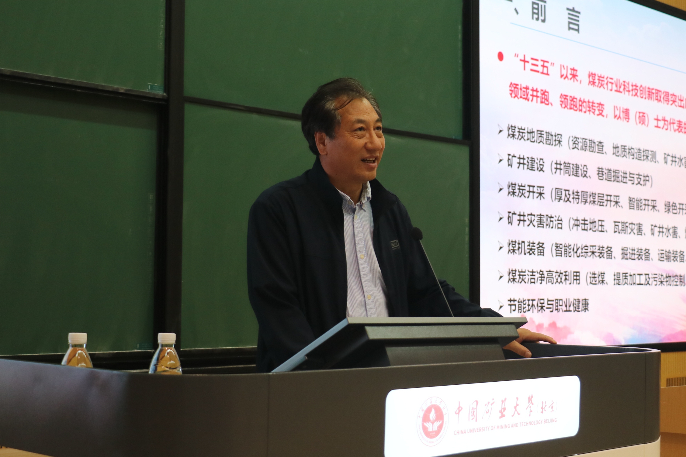 报告中,康红普院士从建设教育强国战略和青年科技人才在煤炭行业科技创新中发挥的重要作用引入,围绕“煤炭科研大有作为”“当前面临的挑战”“体会与建议”三个方面,结合自身科研经历,详细梳理了煤炭开采基础理论、煤机装备基础理论、自动化智能化开采基础理论、重大灾害致灾机制级预测预报等诸多亟待解决的科研难题。他表示,煤炭智能开采、绿色低碳开发、安全开采等方向仍有大量科技难题需要攻克,煤炭科研大有作为,勉励同学们打好专业基础。