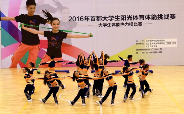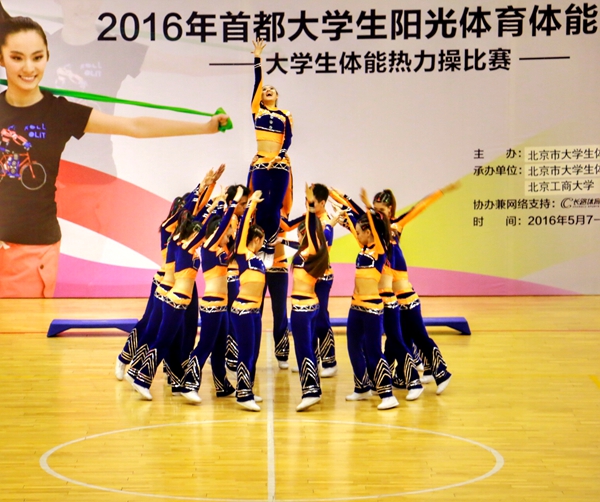 本网讯5月7日,“2016年首都大学生阳光体育体能挑战赛——大学生体能热力操比赛”在北京工商大学举行,来自北京高校的30支队伍参加比赛。我校健美操队勇夺乙组冠军。
