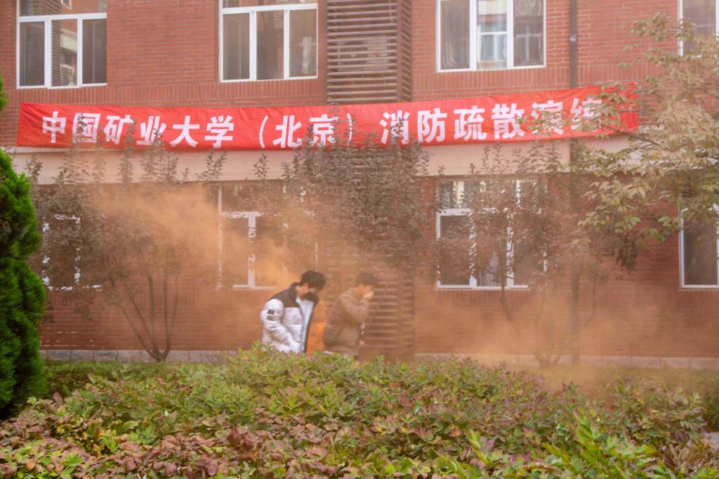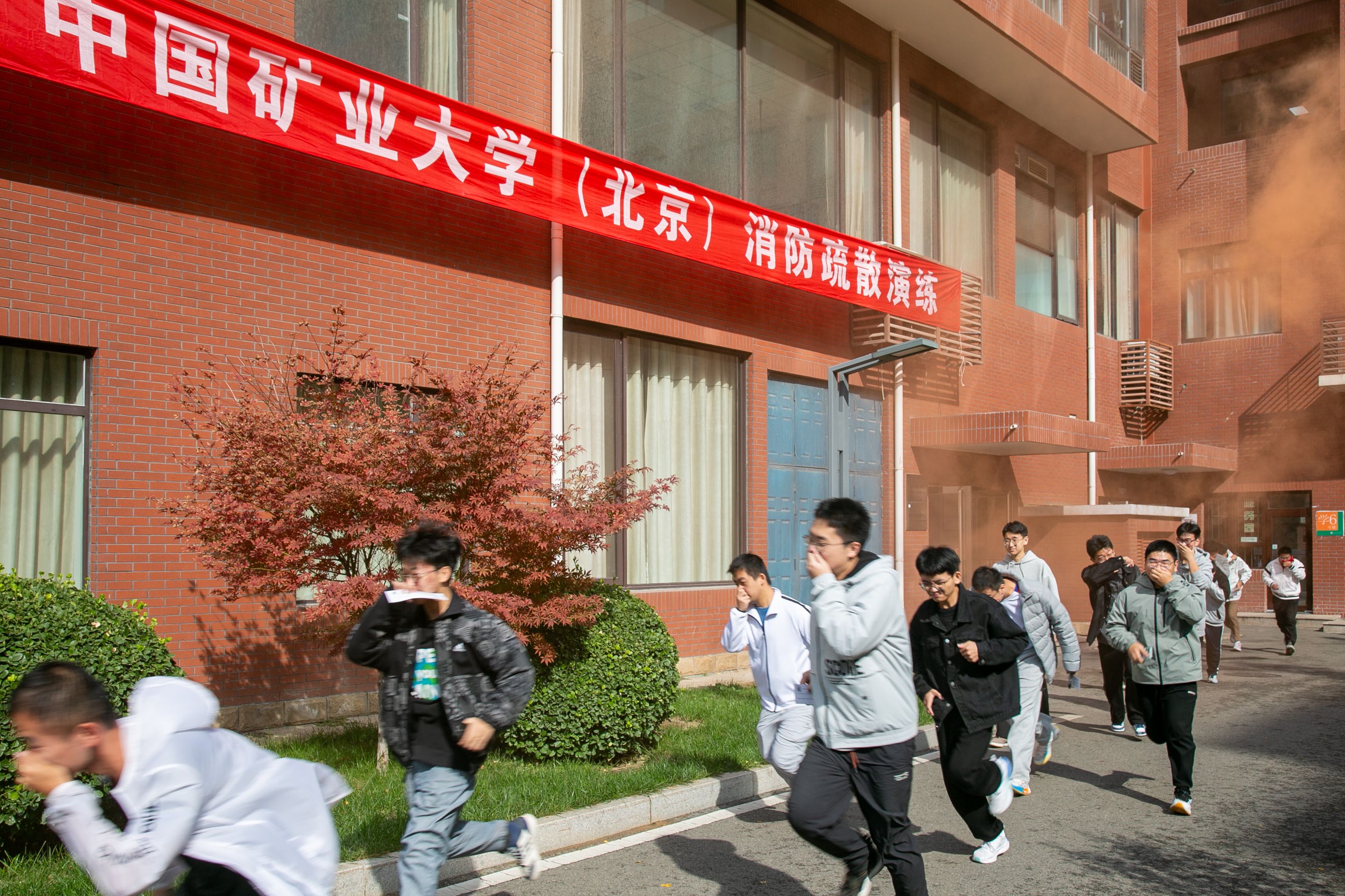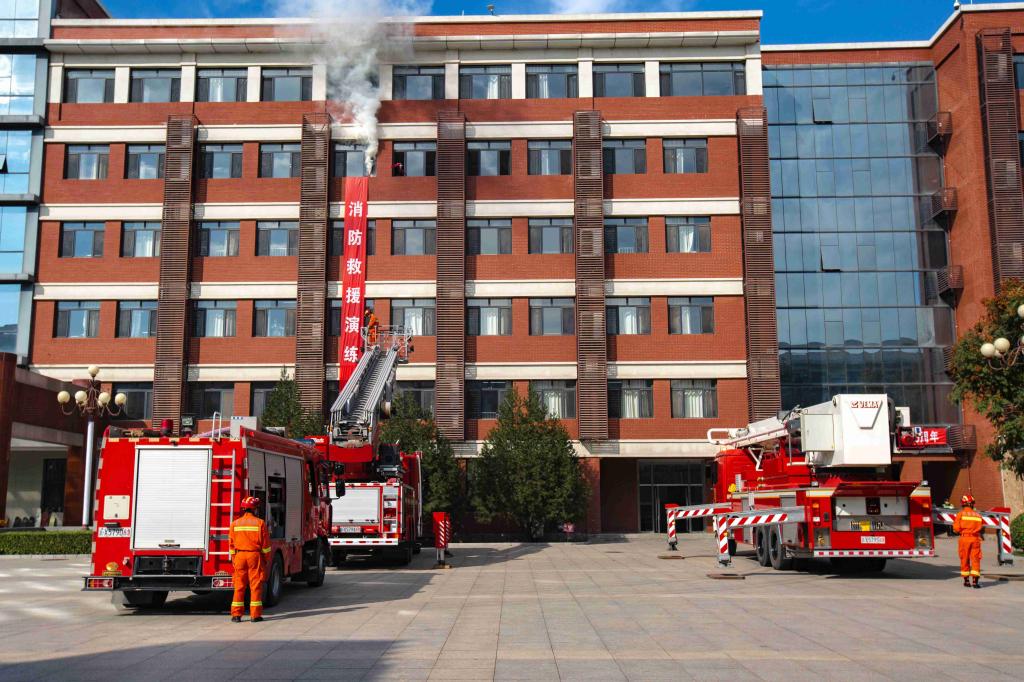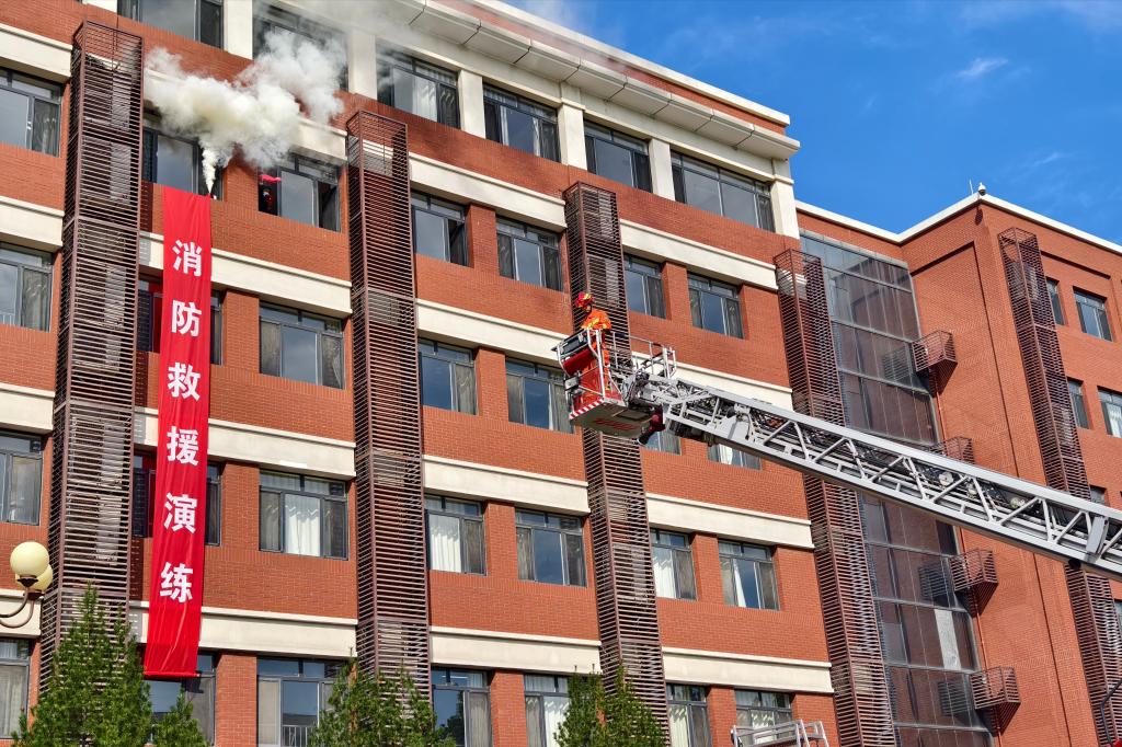 中午12:40,消防疏散演练总指挥发布“疏散演练开始”命令,学1至学7公寓楼模拟起火点同时点烟,“火灾警报”响起,消防中控室值守人员接到报警后,立即启动消防应急预案,消防广播开始连续播报。各公寓楼疏散组从高往低逐层疏散学生。2024级所有学生近4500人在保安员和平安校园志愿者服务队队员的指引下掩住口鼻低姿快速有序撤离“火场”,疏散至南广场和运动场,整个过程紧张有序,用时15分08秒,达到了演练预案预期效果。在场师生还观摩了沙河消防救援站云梯救援、水炮灭火、伤员救助等演练项目。
