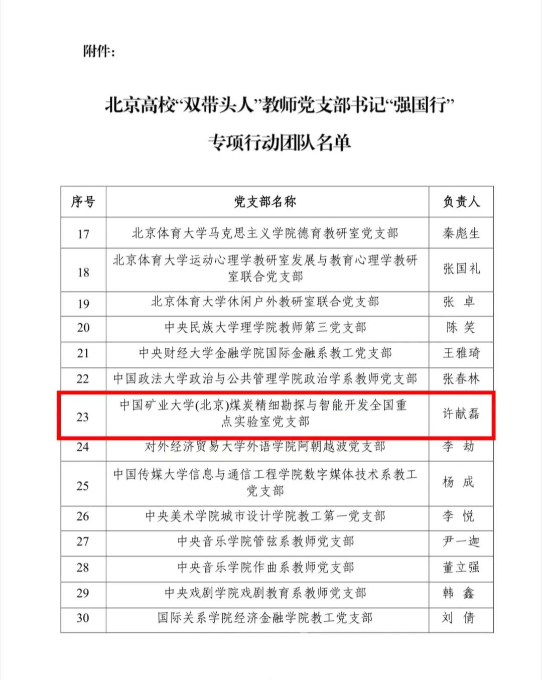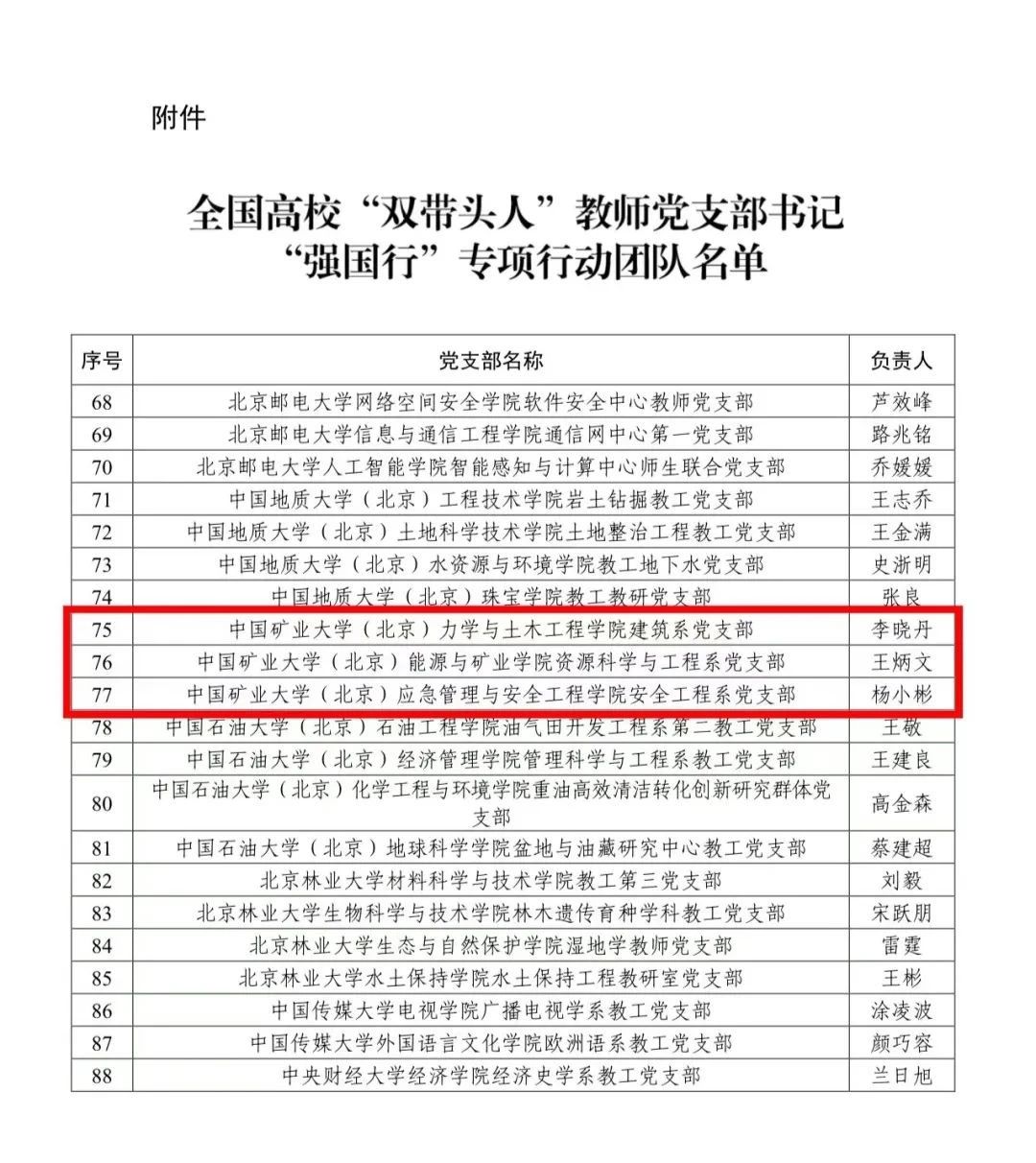 本网讯 近日,全国高校和北京高校“双带头人”教师党支部书记“强国行”专项行动团队名单公布,我校力学与土木工程学院建筑系党支部、能源与矿业学院资源科学与工程系党支部和应急管理与安全工程学院安全工程系党支部3个党支部入选全国高校专项行动团队;煤炭精细勘探与智能开发全国重点实验室党支部入选北京高校专项行动团队,实现学校党建“双创”工作新突破。