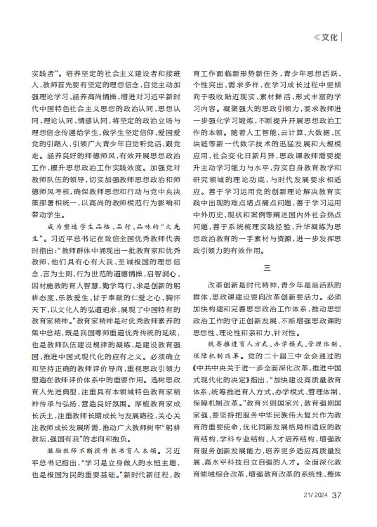 成为塑造学生品格、品行、品味的“大先生”。习近平总书记在致信全国优秀教师代表时指出:“教师群体中涌现出一批教育家和优秀教师,他们具有心有大我、至诚报国的理想信念,言为士则、行为世范的道德情操,启智润心、因材施教的育人智慧,勤学笃行、求是创新的躬耕态度,乐教爱生、甘于奉献的仁爱之心,胸怀天下、以文化人的弘道追求,展现了中国特有的教育家精神。”教育家精神是对优秀教师素养的集中总结,既是我国尊师重道优秀传统的延续,也是教师队伍建设规律的凝练,是建设教育强国、推进中国式现代化的应有之义。必须确立和坚持正确的教师评价导向,重视思政引领力塑造在教师评价体系中的重要作用。选树思政育人先进典型,注重具有本领域特色教育家精神传承与弘扬,营造良好氛围。厚植教育家成长沃土,注重教师长期成长与发展路径,关心关注教师成长发展所需,推动广大教师树牢“躬耕教坛、强国有我”的志向和抱负。