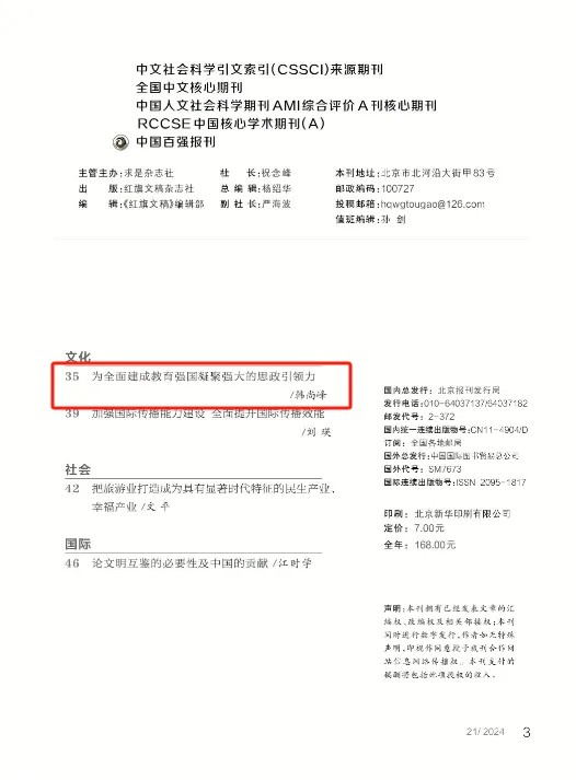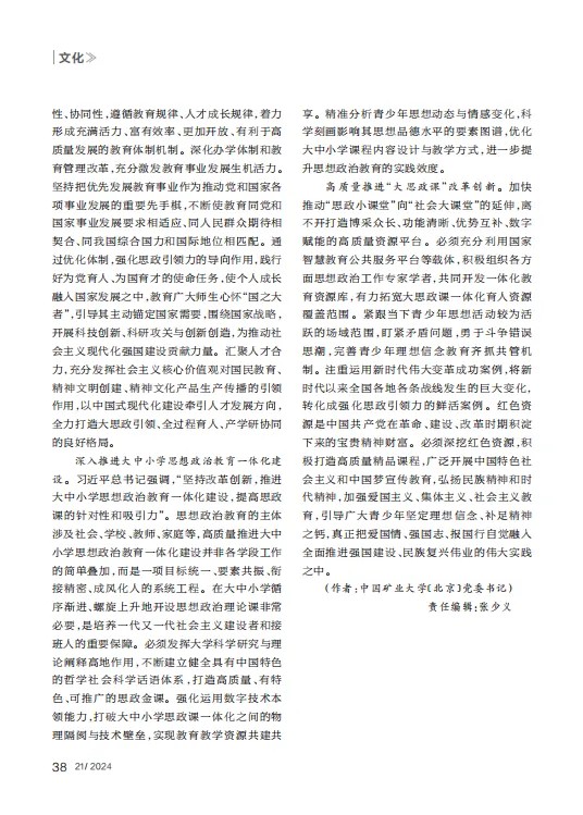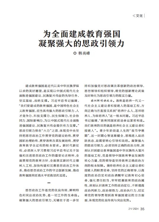 编者按:2024年11月10日出版的《红旗文稿》2024年第21期,刊登中国矿业大学(北京)党委书记韩尚峰文章《为全面建成教育强国凝聚强大的思政引领力》。文章强调思政引领力排在建成教育强国“六力”之首。新时代新征程,必须深入学习贯彻习近平总书记关于加强和改进思想政治工作的重要论述,认真学习贯彻全国教育大会精神,全面贯彻党的教育方针,全面落实新时代立德树人工程,加快构建和完善思想政治工作体系,推动思想政治工作的守正创新发展,推动教育强国向更高水平更高层次迈进。