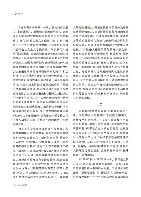 用党的创新理论凝心铸魂。理论只有说服人,才能引领人。凝聚强大的思政引领力,必须以习近平新时代中国特色社会主义思想为指导,讲好“只有社会主义才能救中国,只有中国特色社会主义才能发展中国,只有坚持和发展中国特色社会主义才能实现中华民族伟大复兴”重要原则。要精准把握青少年思想特点,深刻领会习近平新时代中国特色社会主义思想的核心要义,坚持知识讲授与思想引领相统一,及时将党的创新理论武装融入思政课教学之中,加快推进思政课程与课程思政同向同行、相互配合,构建以习近平新时代中国特色社会主义思想为核心内容的课程教材体系。结合实践教学,运用数字技术讲深讲透讲活蕴含其中的历史逻辑与现实逻辑,扎实推动习近平新时代中国特色社会主义思想进教材、进课堂、进头脑,引导青少年树立共产主义远大理想和中国特色社会主义共同理想,自觉肩负起建设社会主义现代化强国的时代使命。加快构建中国哲学社会科学自主知识体系,深化对党的创新理论学术性研究、学理性阐释,在充分发挥哲学社会科学育人功能的同时,不断提升思想政治工作能力和水平。