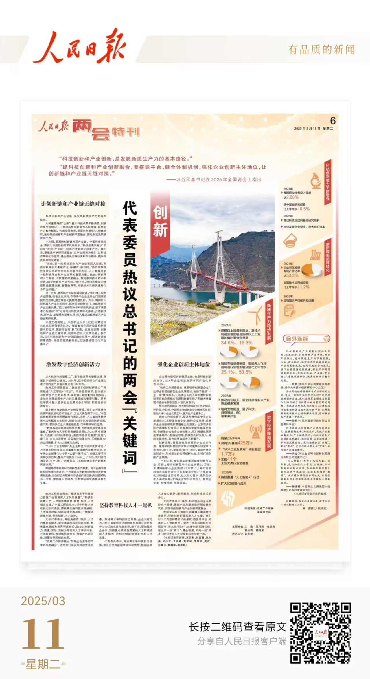 尤政代表表示,高校、科研院所与企业要拧成一股绳,围绕产业发展所需开展全链条攻关,实现科技创新与产业创新深度融合。