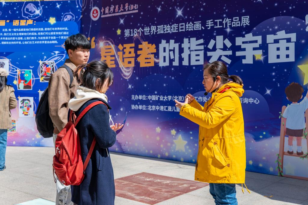 本网讯 4月2日,在第18个“世界孤独症日”来临之际,以“星语者的指尖宇宙”为主题的孤独症儿童绘画、手工作品展活动在学院路校区校史广场举行。活动旨在贯彻教育部、北京市关于大中小学心理健康教育一体化建设的重要指示精神,落实教工委《关于优化提升北京高校学生心理健康工作的行动方案(2023-2025)》的文件要求,联动共建大中小学心理健康教育的衔接纽带,营造重视心理健康的校园文化氛围,进一步提升我校心理健康工作实效。校党委副书记安宇出席活动,北京一零一中矿大分校德育副校长郑娜,学生工作处负责人,心理健康教育咨询中心专兼职咨询师,中国矿业大学(北京)、北京一零一中矿大分校近2000名学生参加了此次活动。