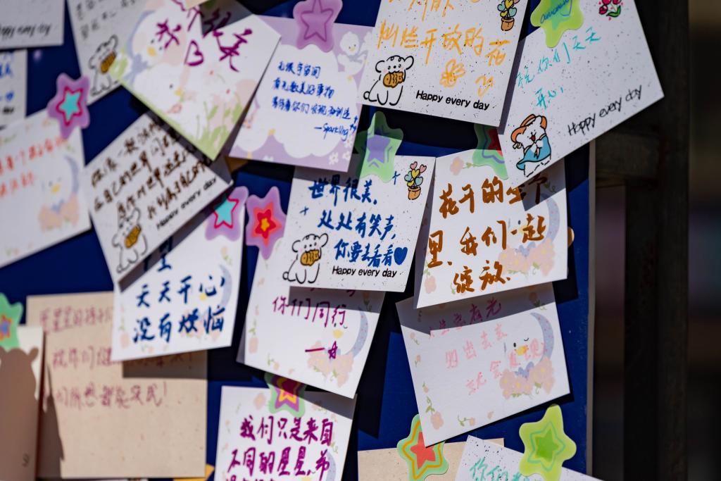本次活动通过展出孤独症儿童及青少年创作的两百余件艺术作品,色彩斑斓的画作、精巧细致的手工艺品,让学生们看见了“星星的孩子”富有创造力的艺术世界,感受特殊群体面对生命的坚韧。活动现场热闹非凡,精心设置的“星光市集,以爱换光”环节,学生们通过书写暖心祝福卡片,换取孤独症儿童的手工作品,“萤火予星光”形成礼物与情感之间的温暖流动,体现了我校学生“助人亦自助”的心灵共济治愈之道。“星光科普,有奖问答”环节中人群络绎不绝,同学们在趣味互动中学习孤独症的症状、成因、治疗方法等知识,现场专业心理咨询师耐心答疑解惑,将晦涩的专业知识转化为通俗易懂的内容,帮助学生们搭建起理解与包容的桥梁。不同年龄段的学生在活动中相互交流、共同学习,让关爱特殊群体的意识扎根于校园文化之中,提高学生对社会责任的思考与担当。