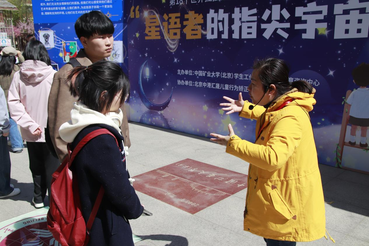 4月2日中午,在第18个“世界孤独症日”来临之际,以“星语者的指尖宇宙”为主题的孤独症儿童绘画、手工作品展活动在中国矿业大学(北京)学院路校区校史广场举行。活动旨在贯彻教育部、北京市关于大中小学心理健康教育一体化建设的重要指示精神,落实教工委《关于优化提升北京高校学生心理健康工作的行动方案(2023-2025)》的文件要求,联动共建大中小学心理健康教育的衔接纽带,营造重视心理健康的校园文化氛围,进一步提升学校心理健康工作实效。中国矿业大学(北京)党委副书记安宇出席活动,北京一零一中矿大分校德育副校长郑娜,学生工作处负责人,心理健康教育咨询中心专兼职咨询师,中国矿业大学(北京)、北京一零一中矿大分校近2000名学生参加了此次活动。