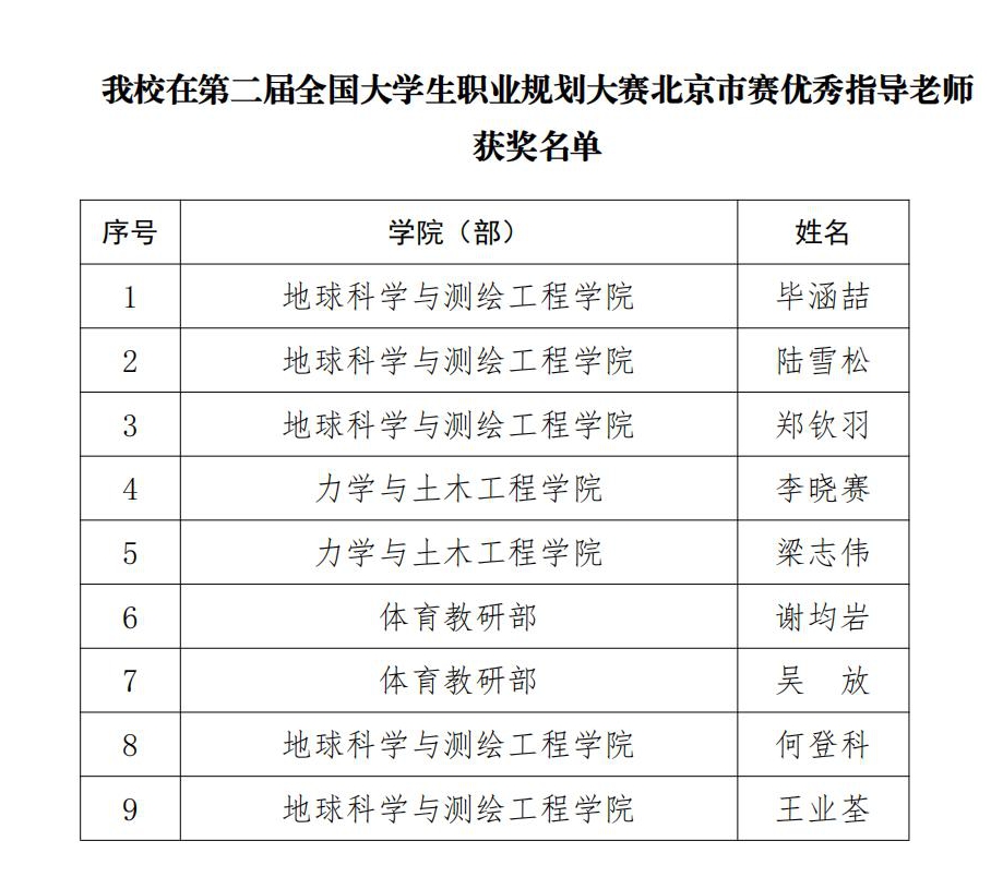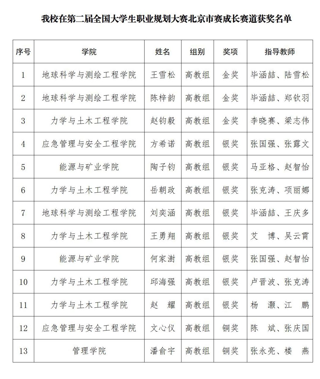 本网讯 4月17日至19日,由教育部、湖南省人民政府共同主办的第二届全国大学生职业规划大赛总决赛在湖南长沙举行。我校首次荣获大赛全国“优秀组织奖”荣誉称号,为北京市3所获奖高校之一(全国共10所部属高校获奖),1名学生首次入围北京市总决赛,取得北京市赛金奖5项、银奖9项、铜奖14项、优秀指导老师9名的佳绩,金奖数位列北京高校第六,金银铜奖累计28项位列北京高校第四,实现了学校在此项赛事中的新突破。
