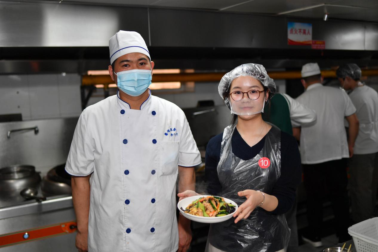 烹饪环节由食堂师傅示范了“花卷”“木须肉”的烹饪流程,向学生们传授烹饪技巧。学生们在食堂师傅的悉心指导下戴上厨师帽,系上围裙,分组参与到食材分拣、菜品制作的过程中。当理论知识转化为动手实操时,学生们深刻体会到:食堂窗口递出的每一份家常菜,都是劳动者凭借多年经验积累下来的“真知灼见”。