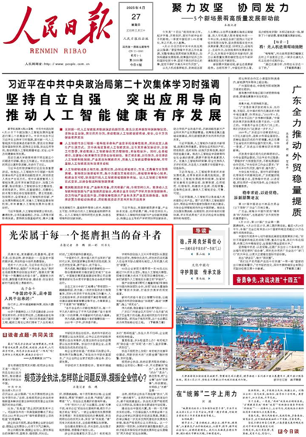 新征程是充满光荣和梦想的远征,没有捷径,唯有实干。无数奋斗者立足岗位、拼搏担当,才能“汇聚全体中华儿女团结奋斗的强大合力”,创造新的成就、赢得更大光荣。