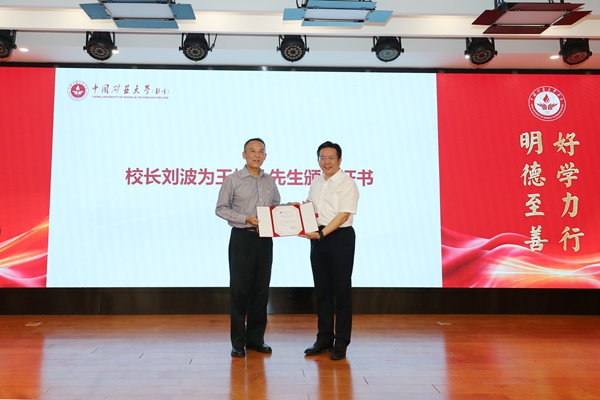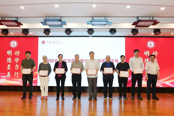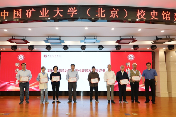 捐赠仪式上,学校为原北京矿业学院院长吴子牧女儿吴小珊女士,原煤炭工业部部长王森浩儿子王旭凡先生,94级校友、原煤炭工业部部长秘书、双城家族办公室创始人乔卫兵先生,以及学校老教授的子女、退休教工近30名捐赠者代表颁发捐赠证书。
