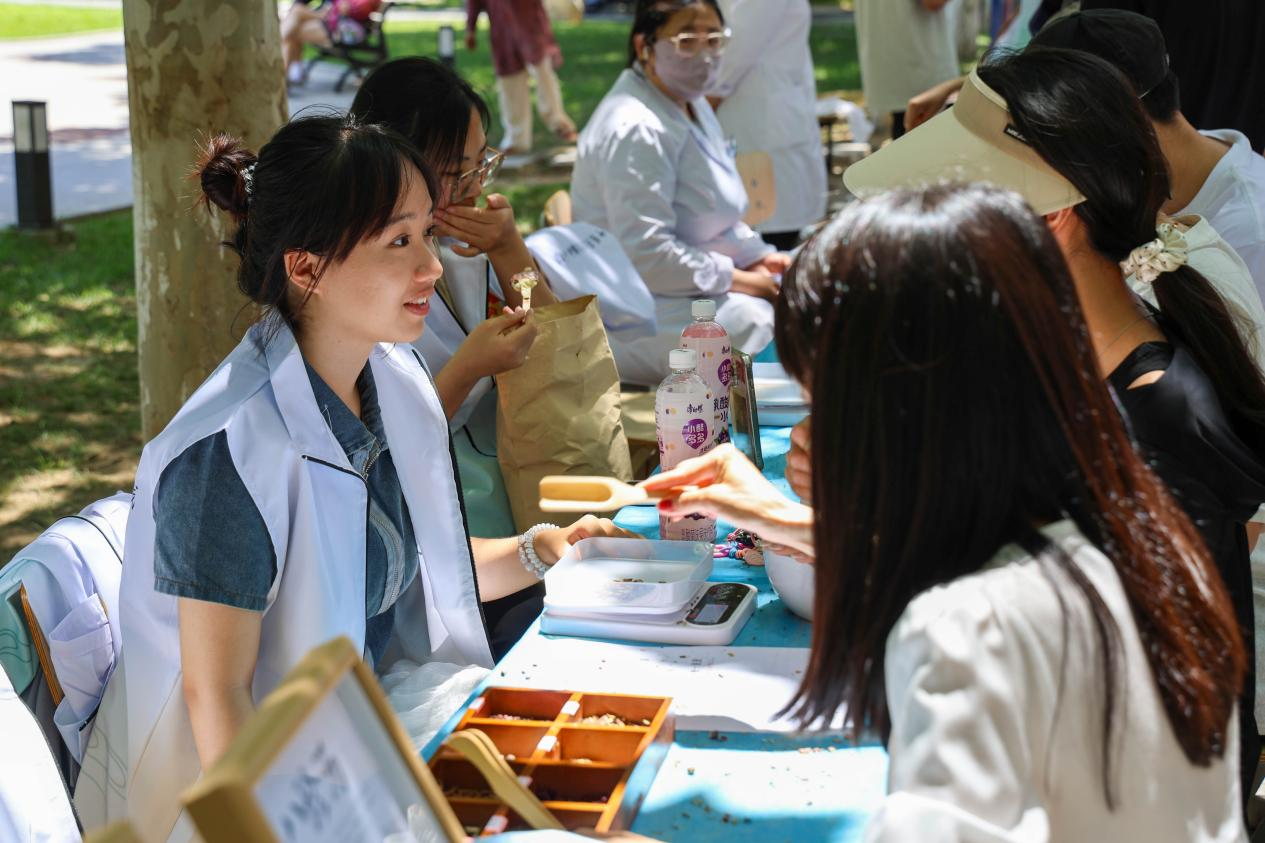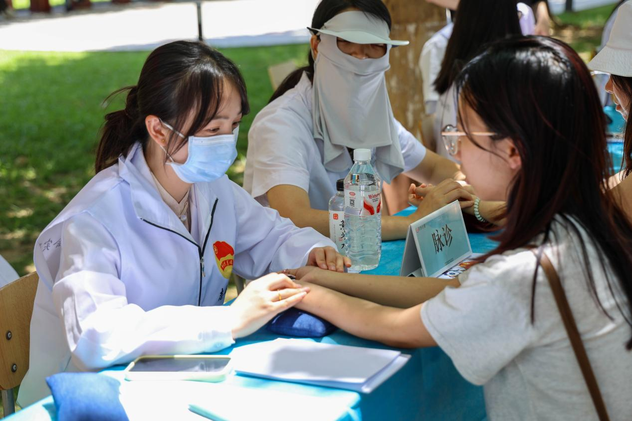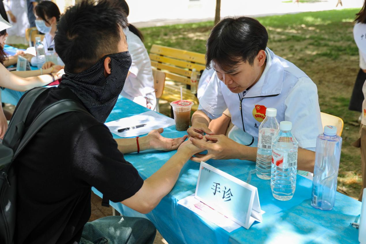 本网讯 6月6日,校医院特邀北京中医药大学共同开展“中医文化进校园健康管理每一天”主题活动。活动现场设置8大体验区,涵盖脉诊、手诊、耳穴压豆、推拿按摩、中医体质辨识、香囊制作、中药经方展示、血压监测等,吸引全校近千人次参与。