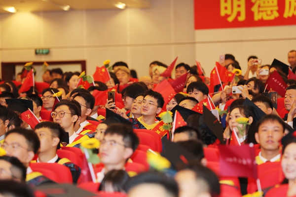 雄壮的国歌声中,毕业典礼开幕。校领导为获得学士、硕士学位的毕业生代表和全体博士毕业生拨穗正冠,颁授学位证书。全场掌声经久不息,为这场青春的盛会喝彩。