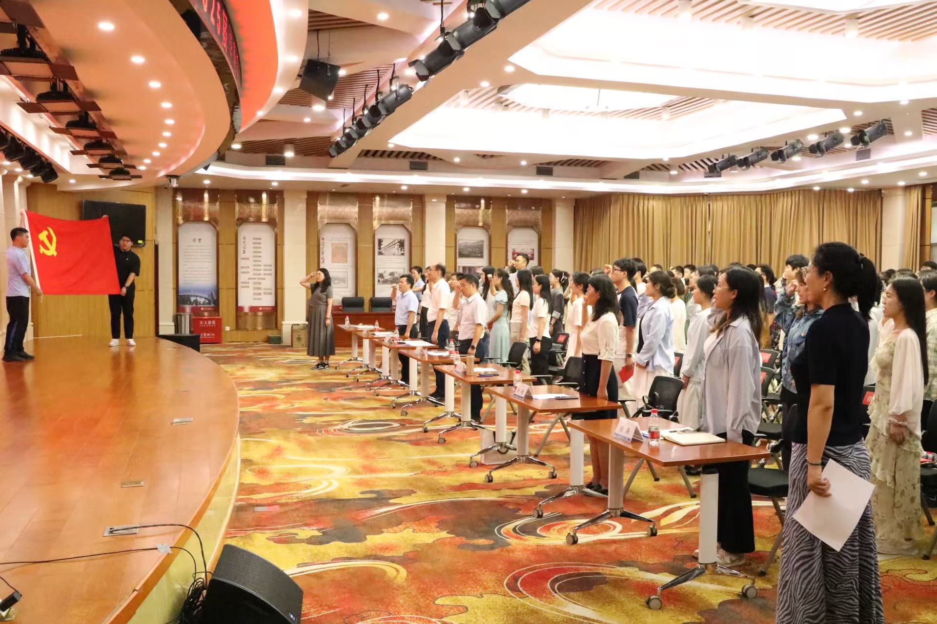 在专职组织员陈慧昀的领誓下,全场党员面向党旗,新接收预备党员集体入党宣誓,全体党员重温入党誓词。