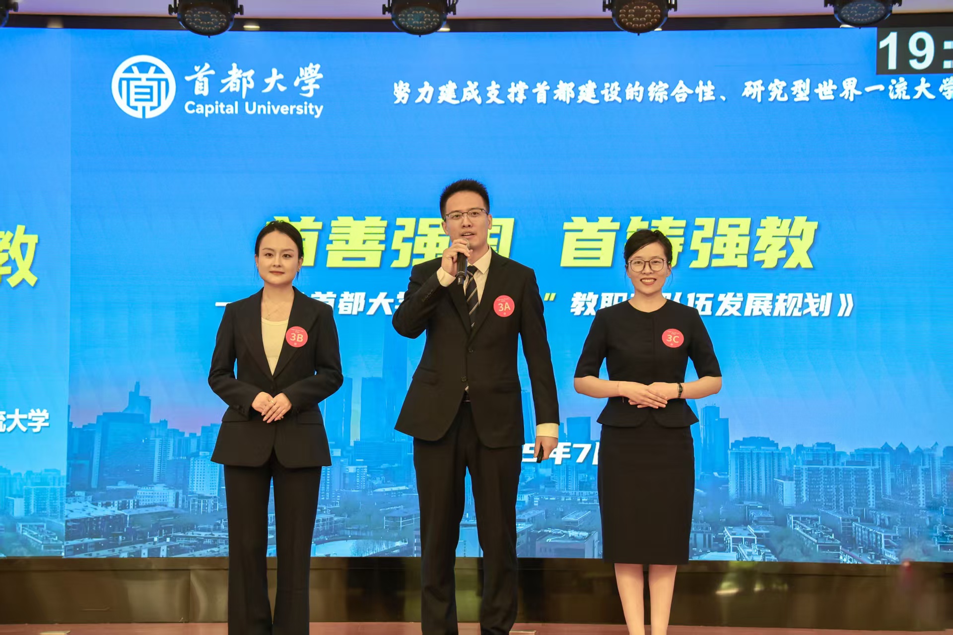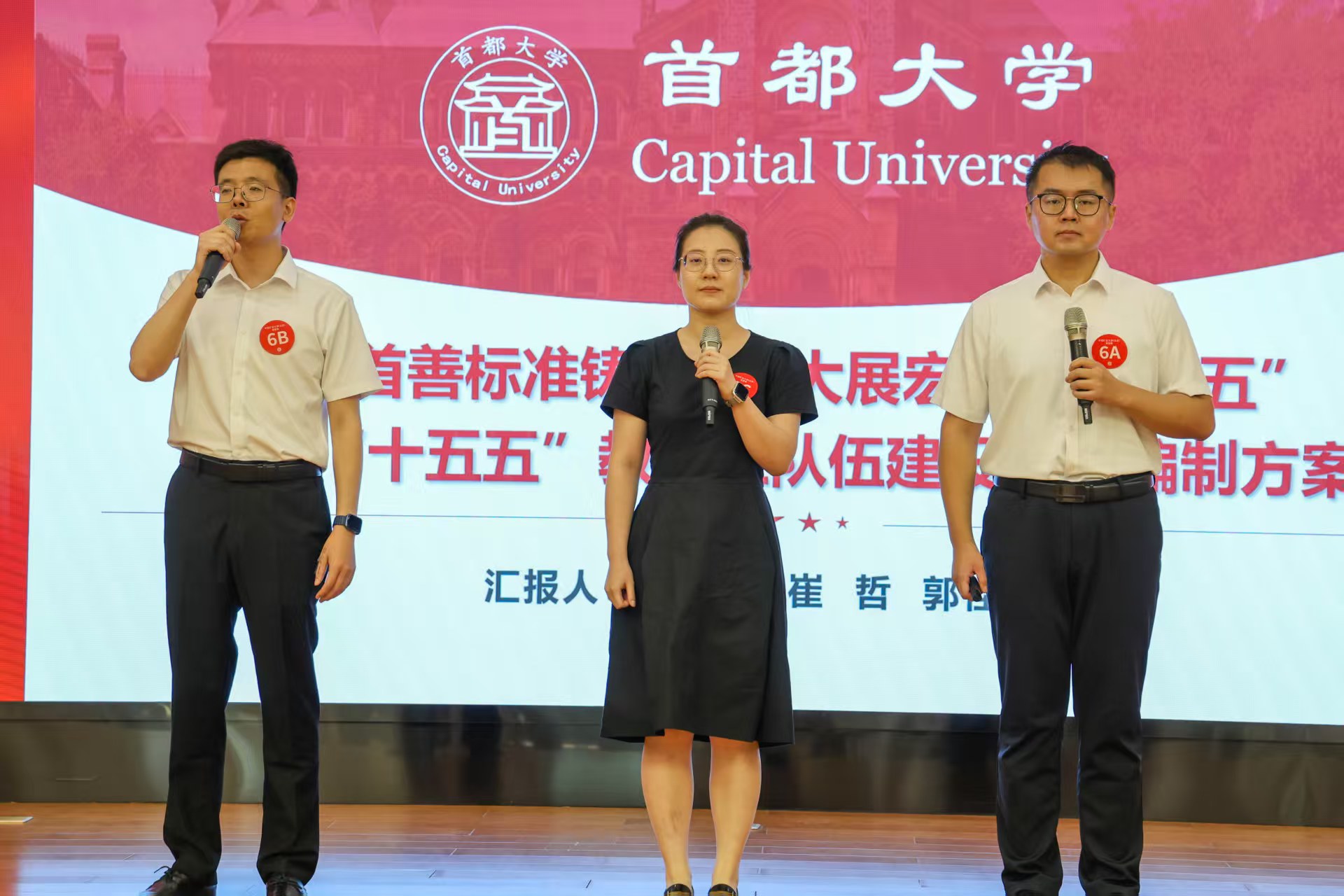 根据比赛命题要求,选手们现场展示了各自编制的“首都大学‘十五五’时期教职工队伍发展规划”和以“弘扬教育家精神”为主题的特色工作方案。大家积极贯彻指导思想,大胆创新工作思维,缜密谋划实施细节,结合自己的工作经验和心得体会,提出了各具特色的工作思路。经过激烈角逐,比赛最终评选团队一等奖1个、二等奖1个、三等奖2个。赛后,校领导与参赛人员合影留念。