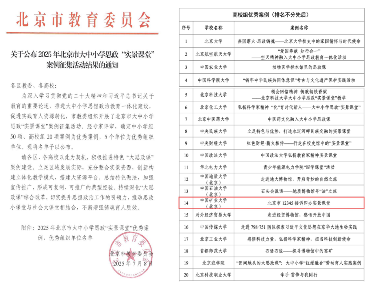 本网讯 近日,北京市教育委员会组织开展2025年北京市大中小学思政“实景课堂”案例征集活动,中国矿业大学(北京)“北京市12345接诉即办实景课堂”思政教学案例获评高校组优秀案例。